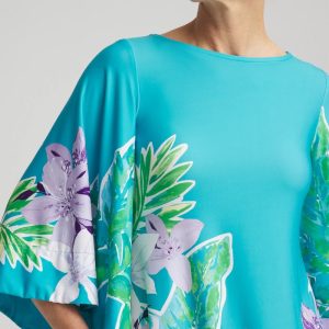 - Fashionable, relaxed-fit with an A-line drape, 3/4-length angel sleeves, and boat neckline.
