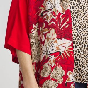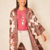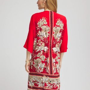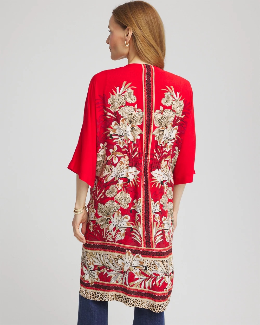 Art Nouveau inspired: flowing, fashionable, feel-good, and ultra-fabulous long mixed-print kimono. This breezy kimono suits all your lightweight layers. Featuring a tropical floral and animal print against a bold red backdrop, 3/4 sleeves, side-slits, and an open front.