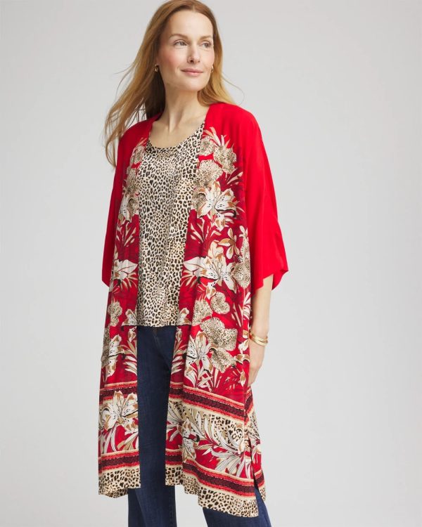 Art Nouveau inspired: flowing, fashionable, feel-good, and ultra-fabulous long mixed-print kimono. This breezy kimono suits all your lightweight layers. Featuring a tropical floral and animal print against a bold red backdrop, 3/4 sleeves, side-slits, and an open front.