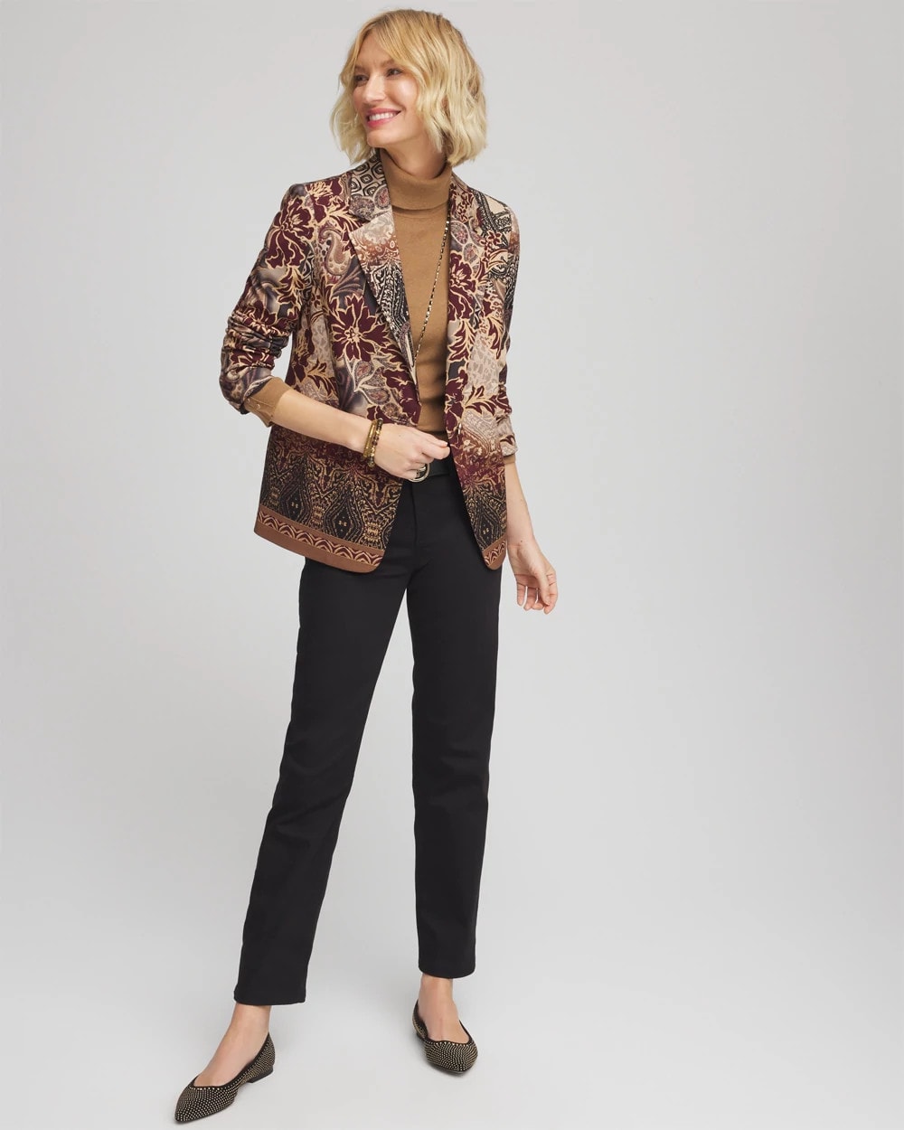 Our bestselling silhouette in an unforgettable, artisanal design. The luxurious look and feel of our polished ponte is just what you need this season to help you look and feel your best. Featuring sleek lining, lapels, slimming angled front flap pockets, and a front closure.
