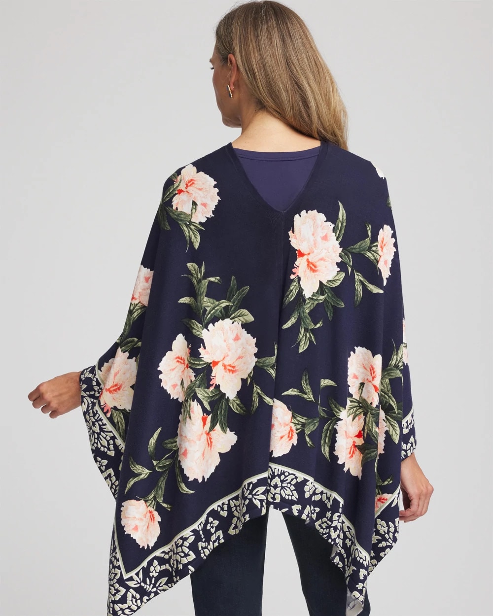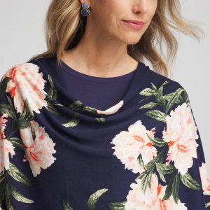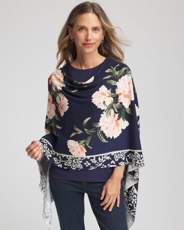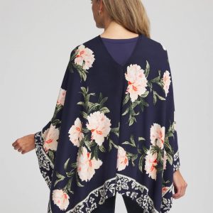 A feminine floral print against a dark background and border trim help define thisAsymmetrical Convertible Sweater Poncho. Perfect for travel—wear as a sweater or poncho.