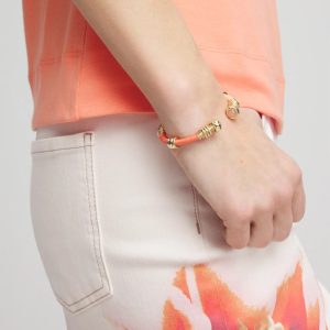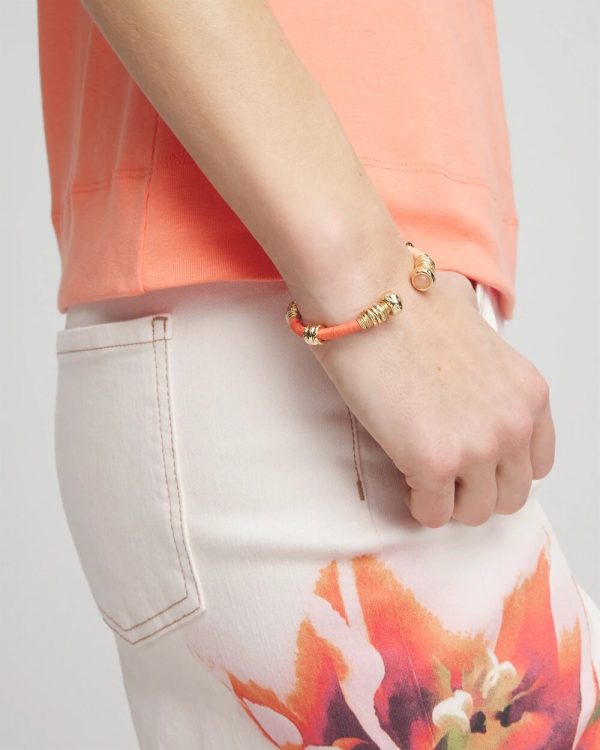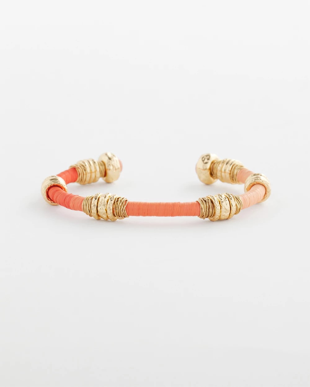 Tonal orange raffia combines with feel-good aventurine stone and golden accents to create a stunning new stretch cuff bracelet. Stack this easy fit, perfectly stackable bracelet with orange, neutral, and goldtone bracelets. Pair with like necklaces, earrings, and outerwear.