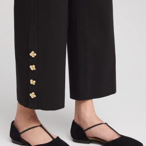 The new Brigitte™ Cropped Wide-Leg Pants have a stunning floral button accents on the hem and a panel that extends all the way around you slimming, and trimming your shape. Angled front pockets enhance the effect. Plus, the rise sits just below the natural waist, offering comfort and style for everyday or party wear.