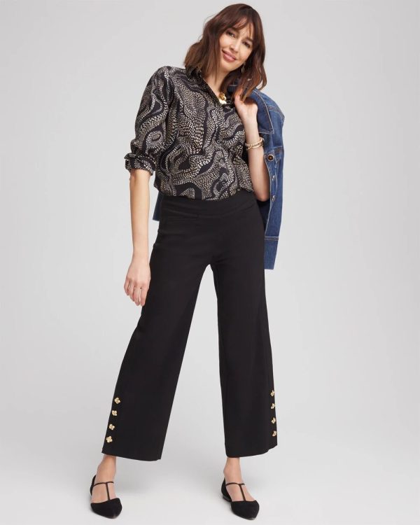 The new Brigitte™ Cropped Wide-Leg Pants have a stunning floral button accents on the hem and a panel that extends all the way around you slimming, and trimming your shape. Angled front pockets enhance the effect. Plus, the rise sits just below the natural waist, offering comfort and style for everyday or party wear.