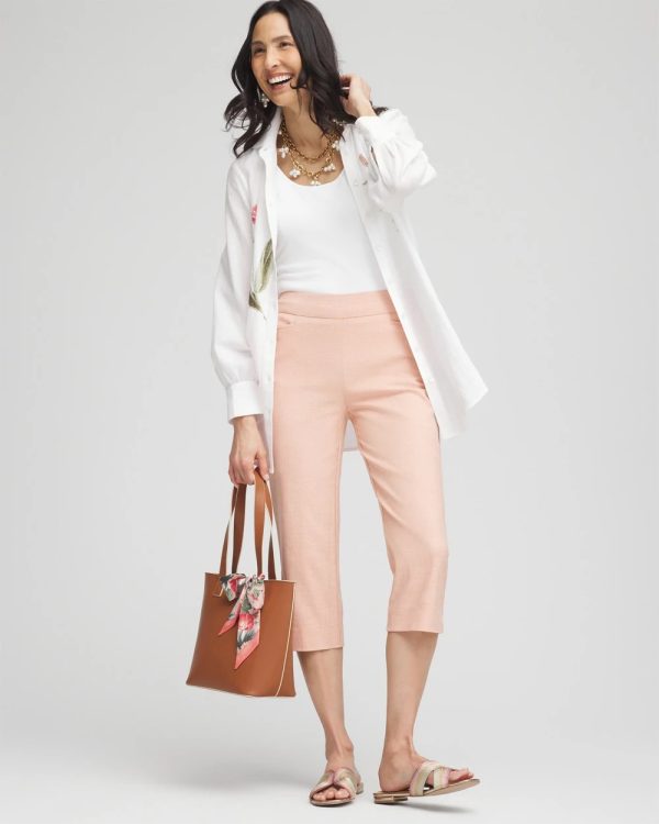 This new debut of Chico’s Brigitte™ Cross Dye Capri Pants showcase a slim leg and ultra-flattering fit. Showcasing Chico’s signature So Slimming® built-in shaping solution, extending 180 degrees around for the ultimate flattering fit. Featuring stretch-and-recovery, slim-stretch fabric.