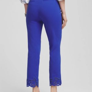 The perfect pair of pull-on crops for the season. Cut for a slim leg, straight silhouette with cutwork hemline recreating a starfish effect. Showcasing Chico’s favored So Slimming® inner tummy panel for slimming and trimming your shape for a smooth look and feel. Angled, front welt pockets enhance the effect. Featuring faux back welt pockets. The rise sits just below the natural waist, offering comfort and style for everyday or party wear.