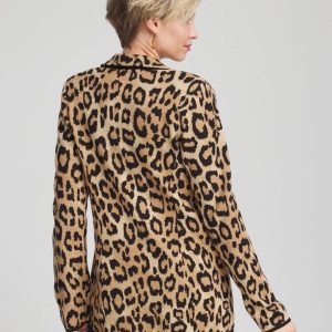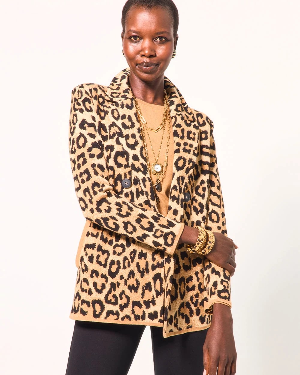 An eye-catching cheetah jacquard motif, slim shoulder pads for a touch of structure and shape, peak lapels, and welt pockets with a neutral accent help define this must-have Cheetah Jacquard Blazer.
