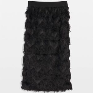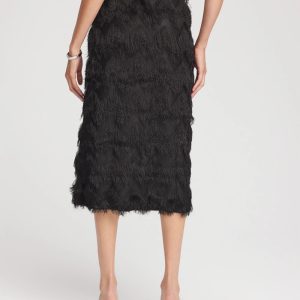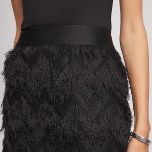 The perfect party skirt. Showcasing an all-over fringe with a chevron appearance. Featuring a slimming waistband, luxurious lining, and flawless fit, this skirt is an outfit maker. Pair with the season’s matching chevron fringe party top.