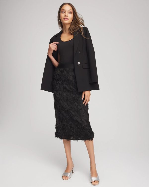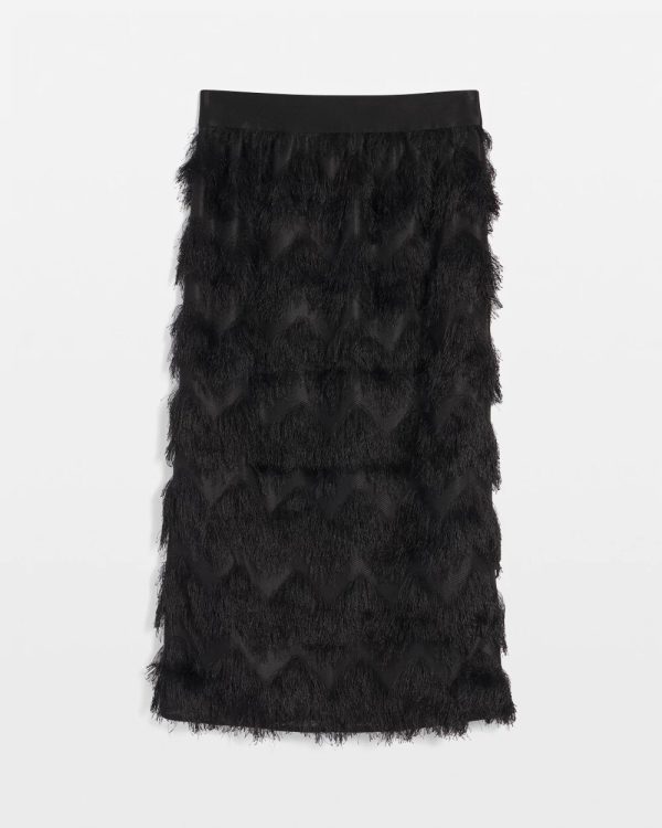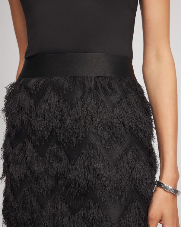 The perfect party skirt. Showcasing an all-over fringe with a chevron appearance. Featuring a slimming waistband, luxurious lining, and flawless fit, this skirt is an outfit maker. Pair with the season’s matching chevron fringe party top.