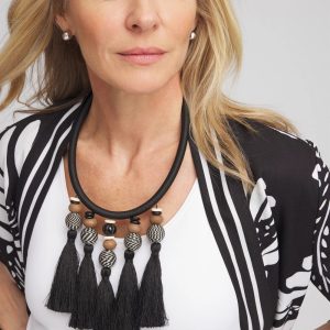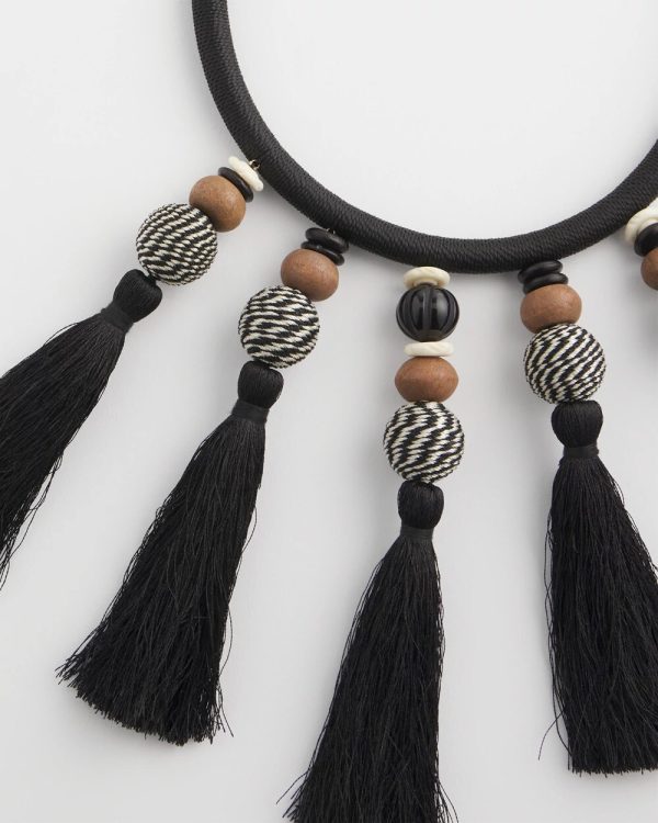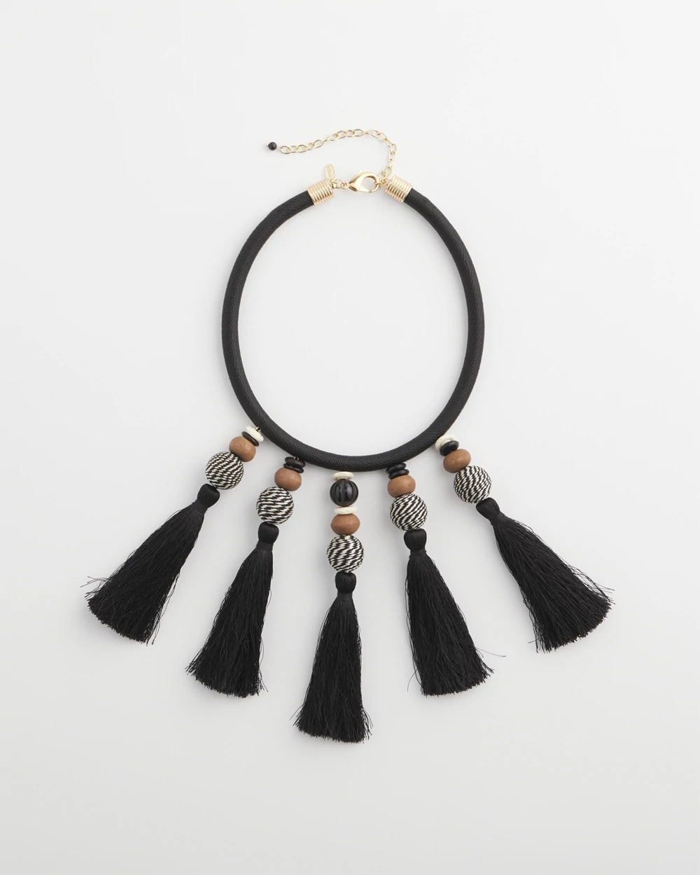 An air of nature, artistry, and high-drama help define this Chico’s Originals Tassel Statement Necklace. Featuring a medley of creatively woven tassels, wood, resin, and bone beads. Experience our designer’s commitment to quality craftsmanship, carefully crafted to form this statement necklace’s unique construction. Part of our Global Textures Collection. Pair with a casual tee and jeans or with a colorful ensemble.
