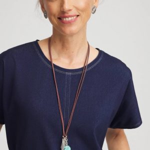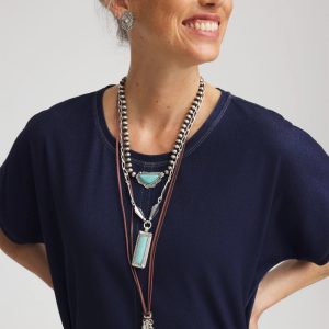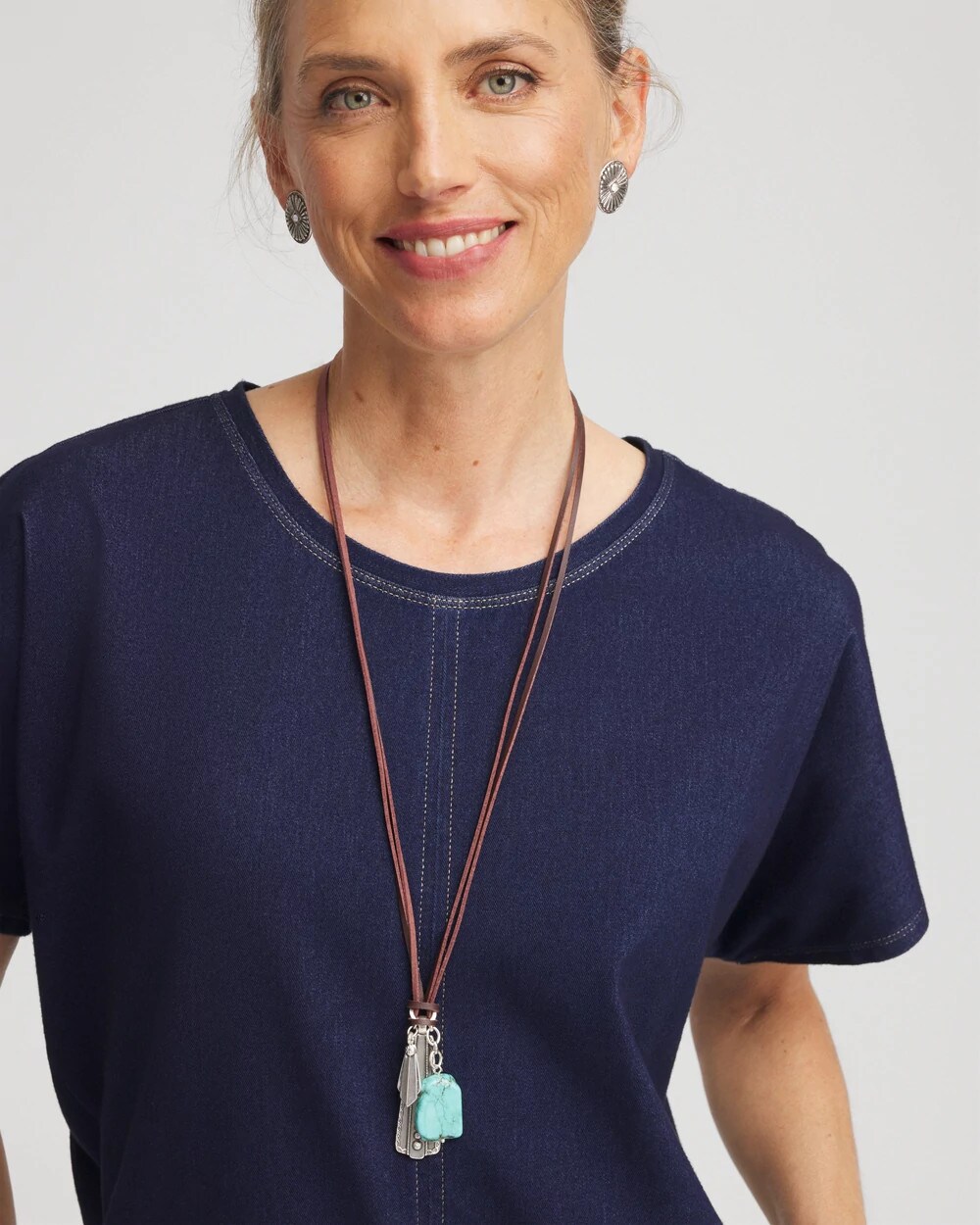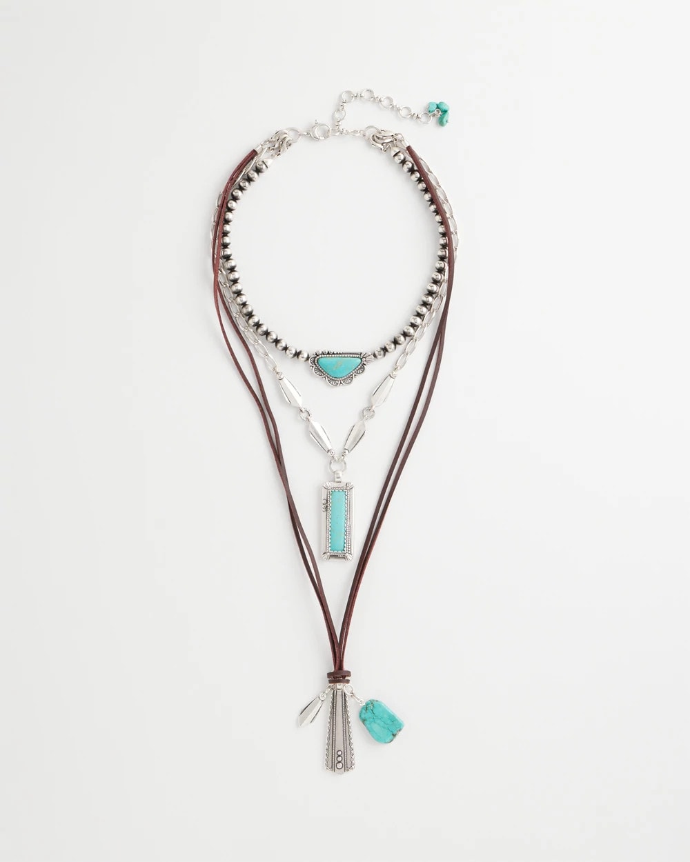 Three ways to wear convertible necklace showcasing a turquoise and charms motif. Can be worn as a three-layer statement necklace with mixed-media chains and charms or one layer at a time. Pair with other silvertone pieces especially from Chico’s Regional Gems Turquoise Collection.