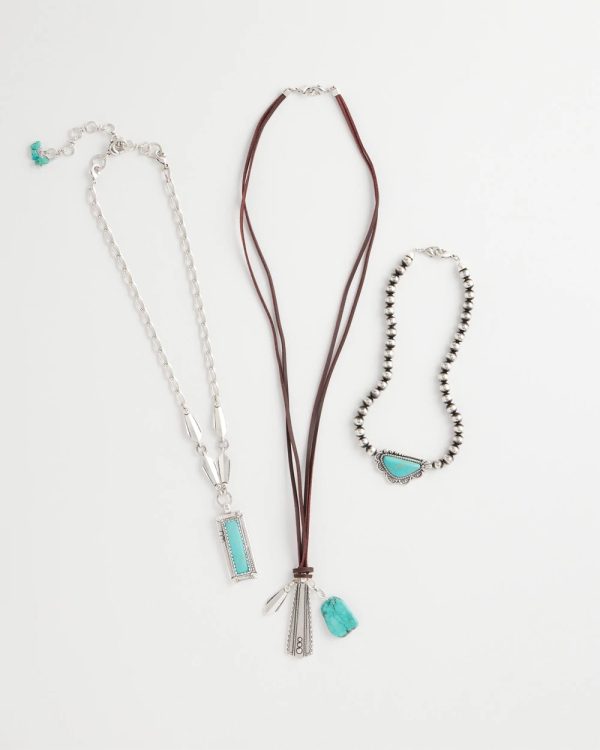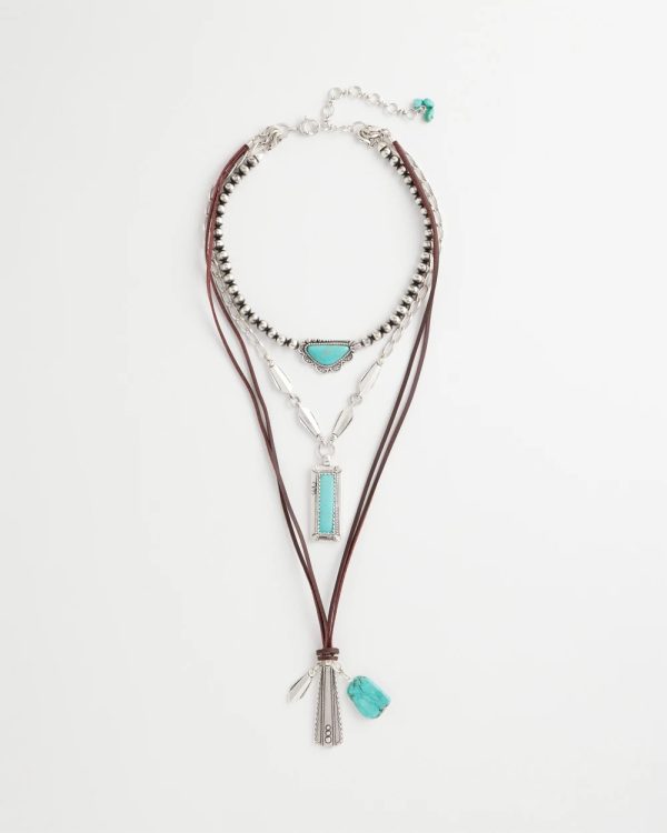 Three ways to wear convertible necklace showcasing a turquoise and charms motif. Can be worn as a three-layer statement necklace with mixed-media chains and charms or one layer at a time. Pair with other silvertone pieces especially from Chico’s Regional Gems Turquoise Collection.