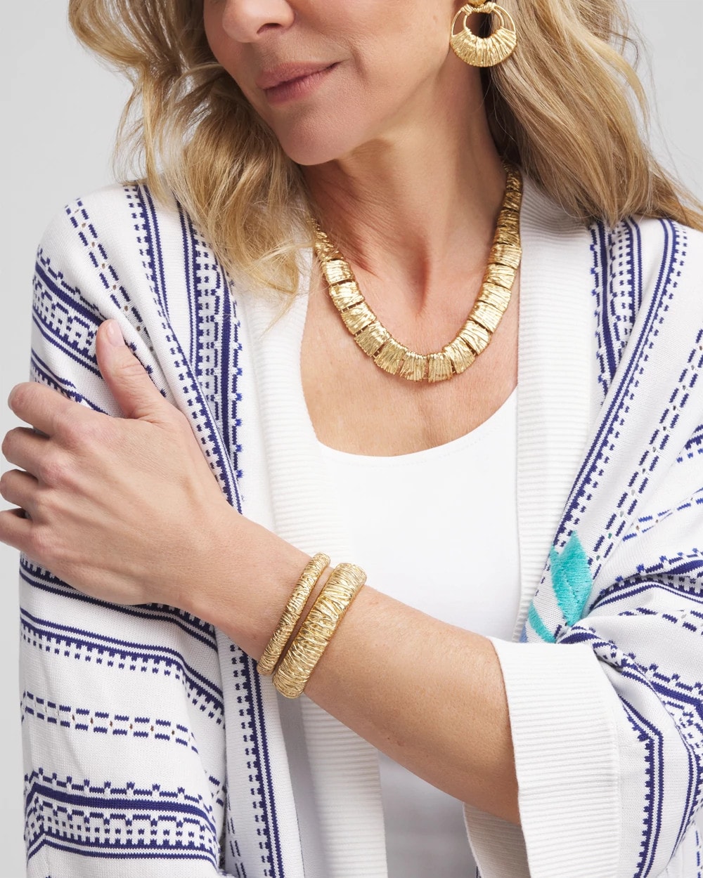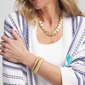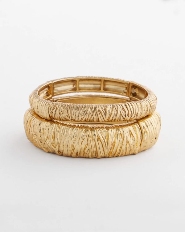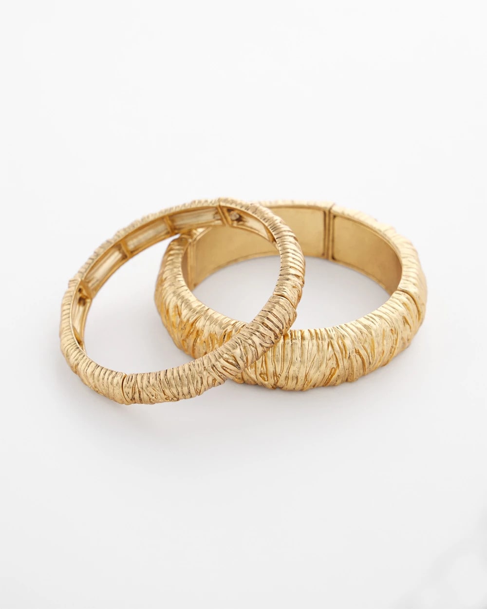 Reimagine your fashion basics with these new gold-tone bangles. Showcasing a special technique that recreates a vintage gold effect with a crinkle, ribbon design. Mix and match with like pieces from Chico’s new Fashion Basic Collection.