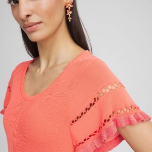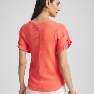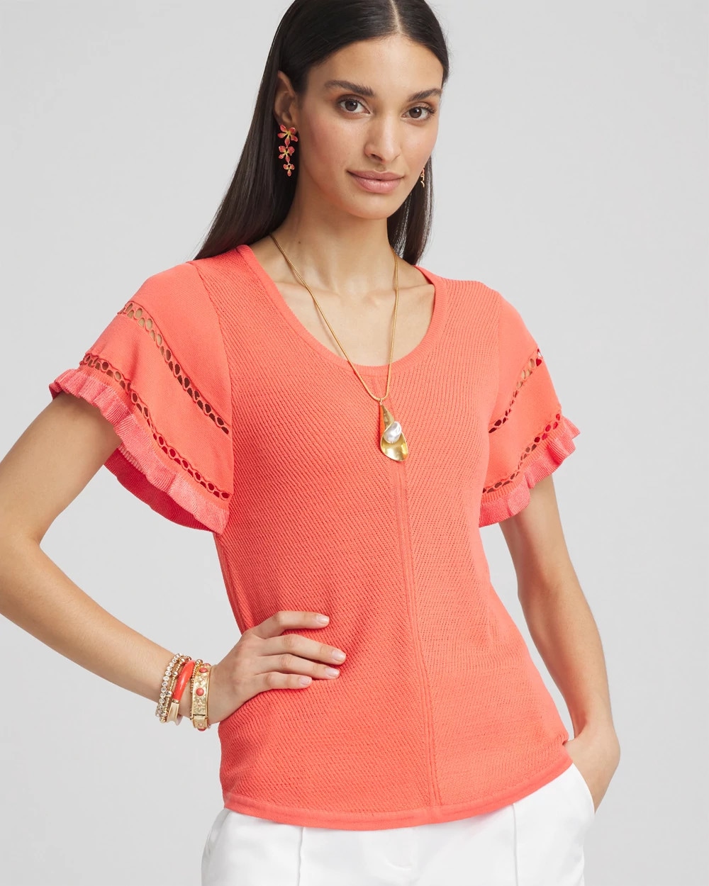 This new Chico’s Cutout Short-Sleeved Pullover Sweater is the perfect addition to your lightweight sweater wardrobe. Showcasing short, flutter sleeves with two layers of cutout design detailing.