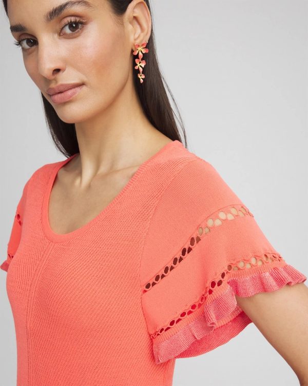 This new Chico’s Cutout Short-Sleeved Pullover Sweater is the perfect addition to your lightweight sweater wardrobe. Showcasing short, flutter sleeves with two layers of cutout design detailing.