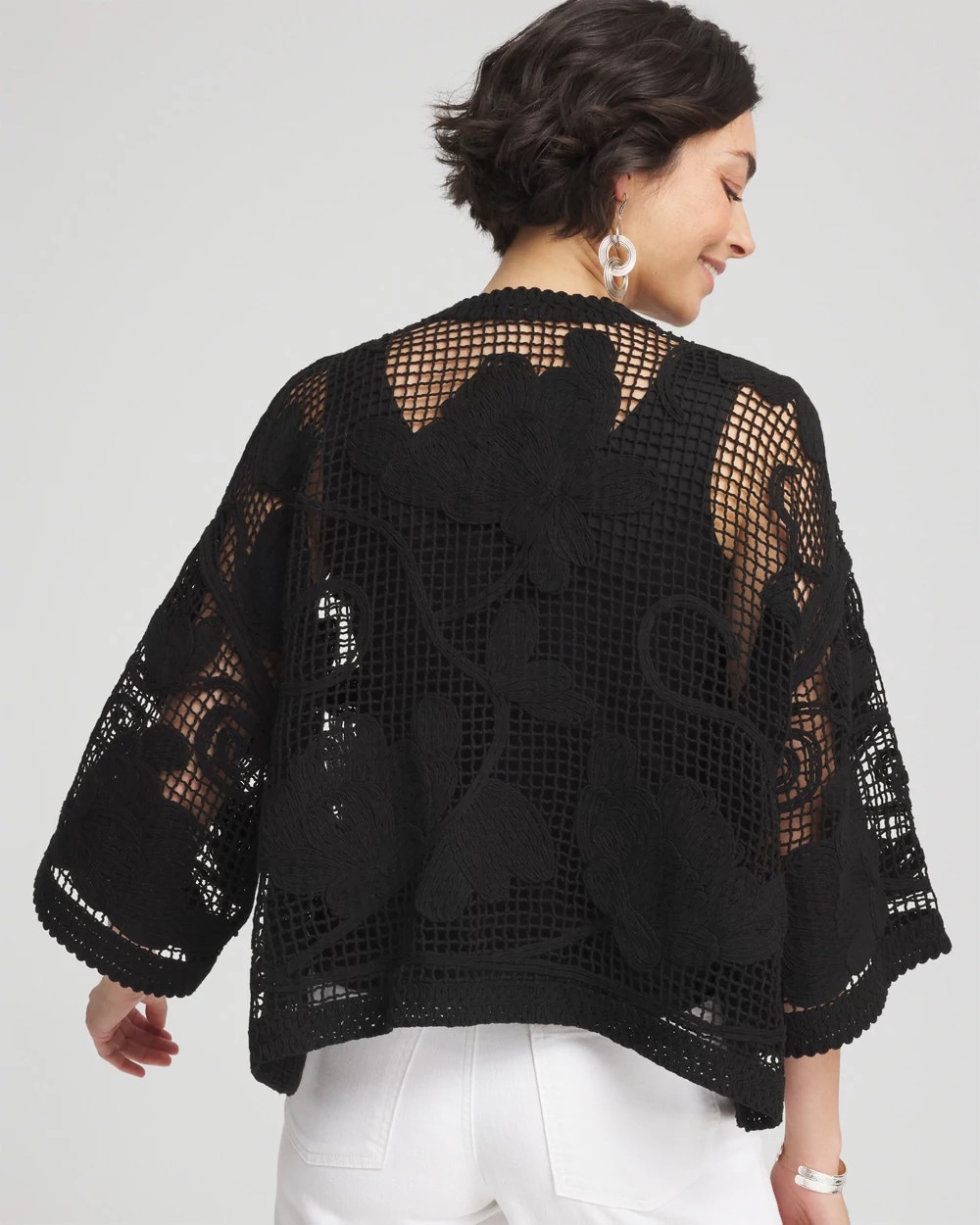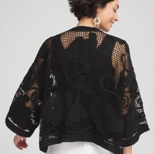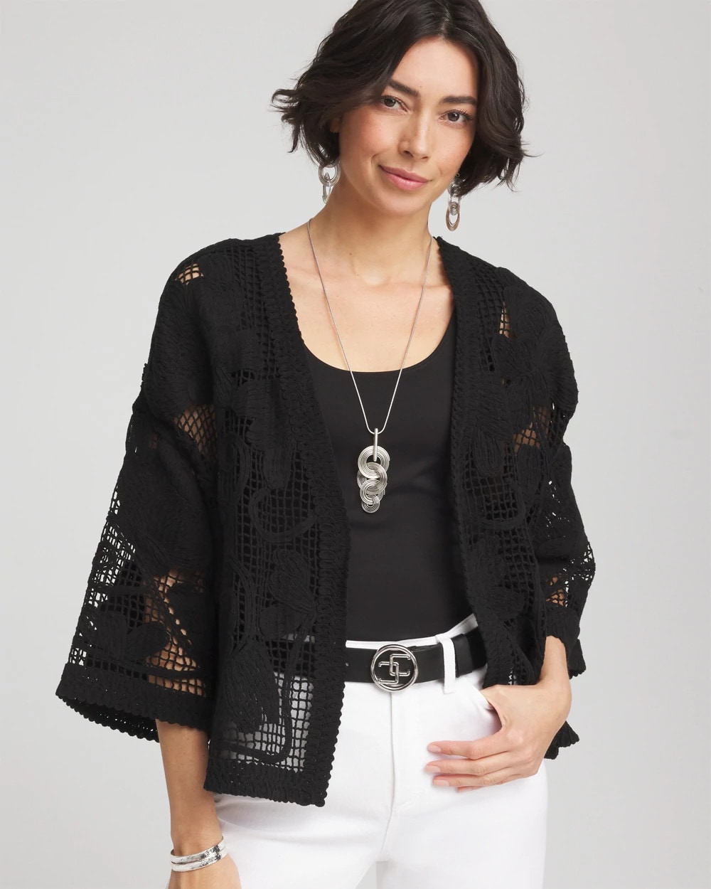 Perfect for topping everything from camisole’s to tees and tanks, this lace kimono adds a delicate, fashionable layer of femininity. Lightweight, open-front, short kimono with 3/4 sleeves.