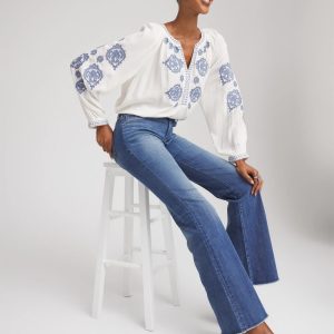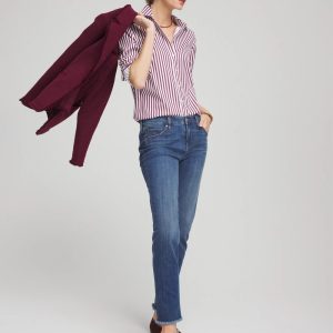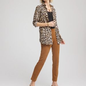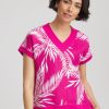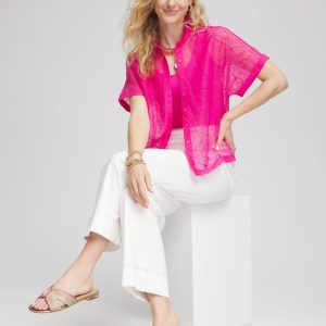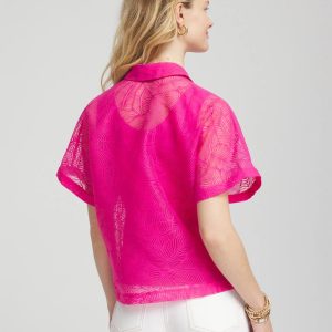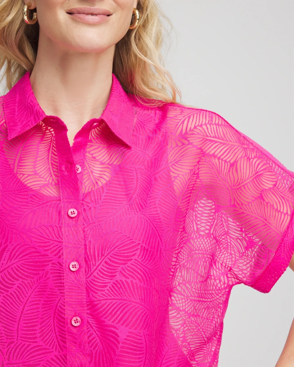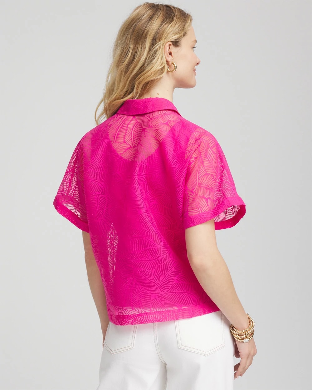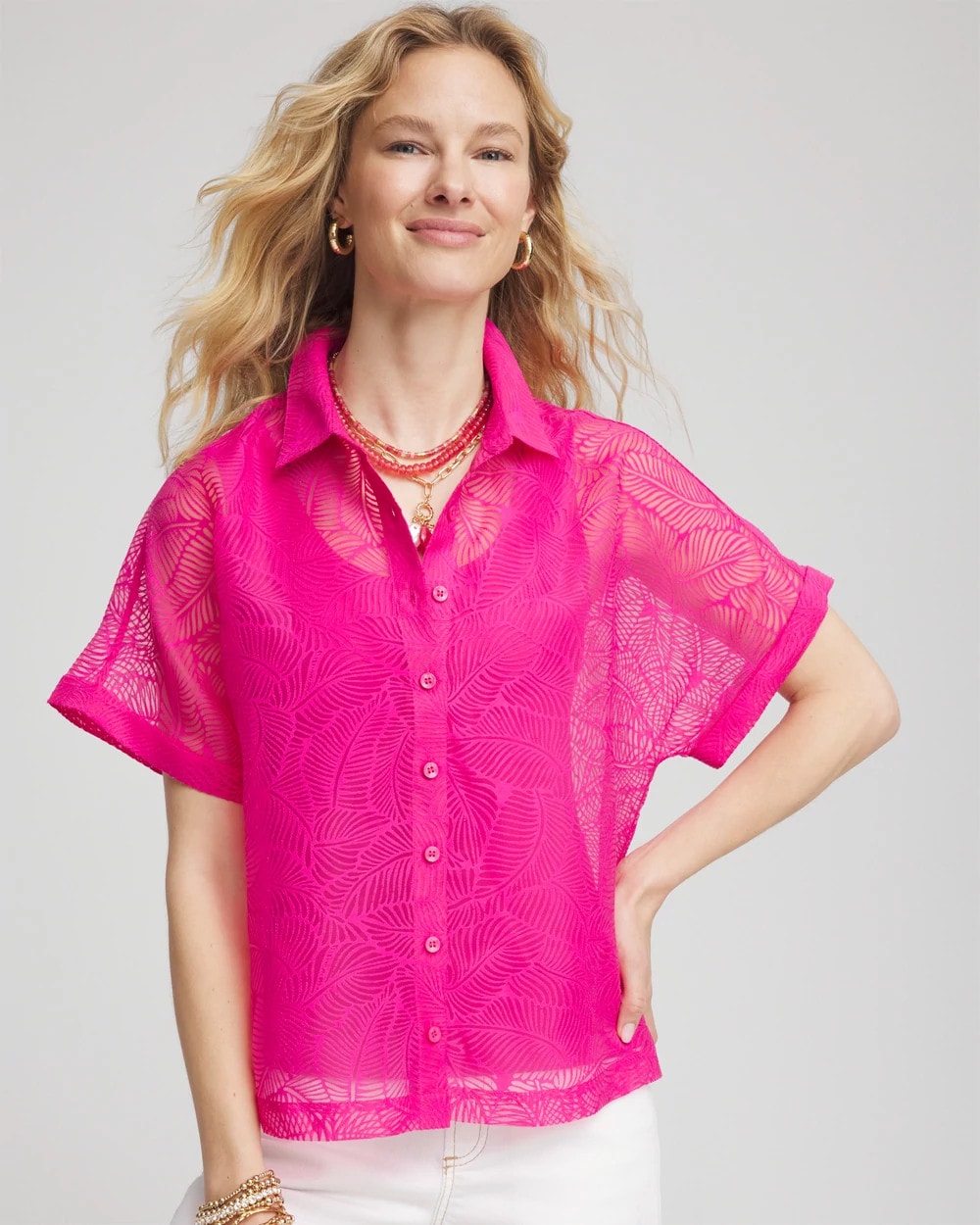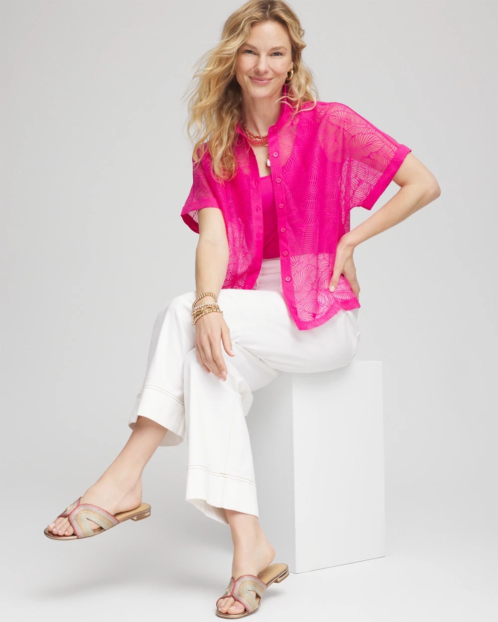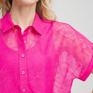 An ode to Art Deco—bold pink hues join forces with the season’s island inspired motif—a sheer bamboo burnout elevates this straight silhouette top into effortlessly chic territory. Featuring a crew neckline, shell-inspired buttons with a point collar.