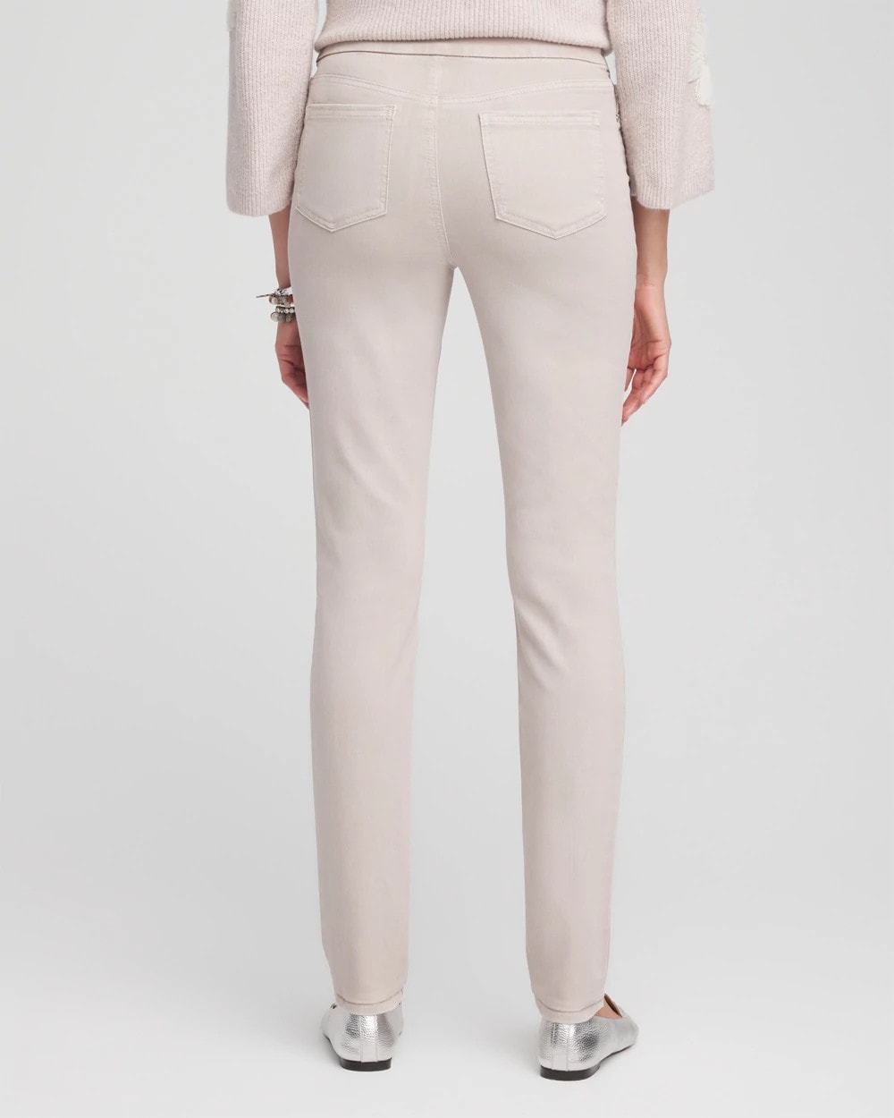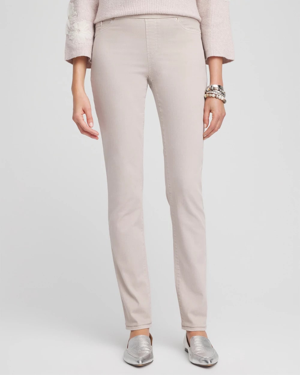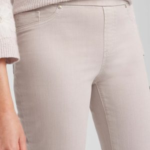 - The Fit: Slim through hips and thighs to the knee; faux front pockets, back pockets and pull-on styling; 30.5″ inseam.