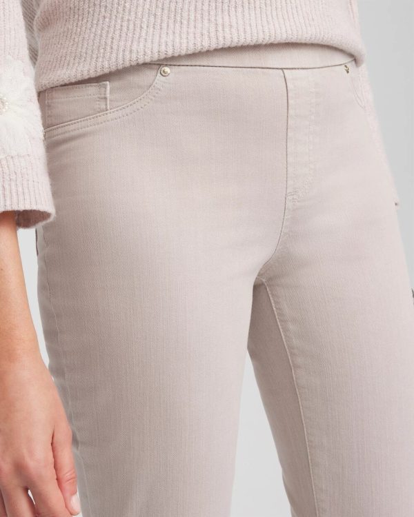 - The Fit: Slim through hips and thighs to the knee; faux front pockets, back pockets and pull-on styling; 30.5″ inseam.