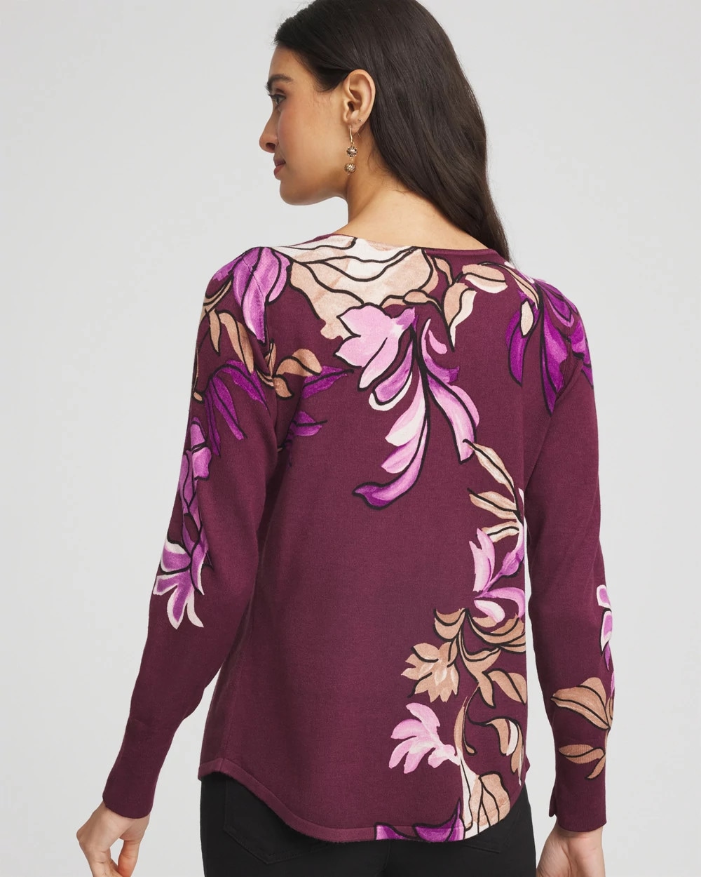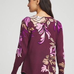 The Ella V-Neck Artisanal Pullover Sweater, in a rich Chianti, showcasing an artistic print, placed in a way that flatters your shape while merging art and fashion. The cuffs have ribbing and non-functional button detailing for added depth and texture. Paired with our Brigitte™, Emme pants or jeans, this sweater is sure to be one of your all-time favorites.