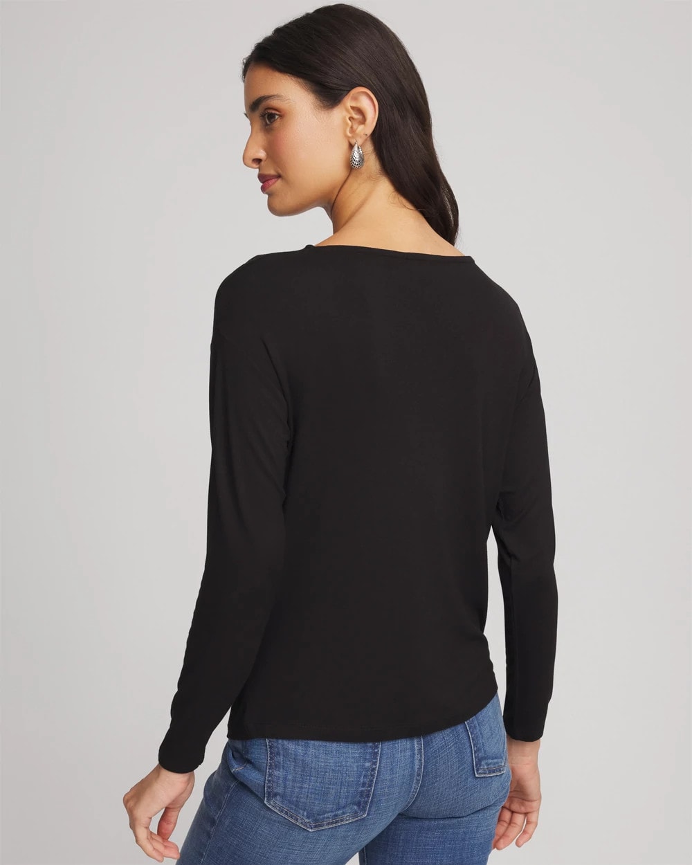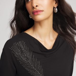 A touch of sparkle makes this casual style a perfect party top—the Embellished Cowlneck Dolman Tee features a dazzling peacock feather on the front yoke.
