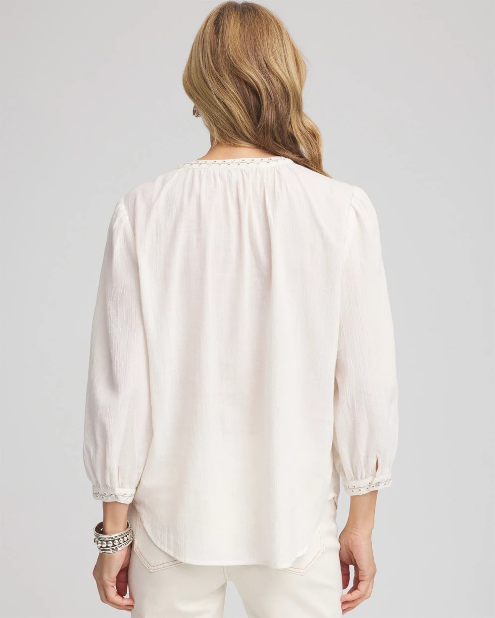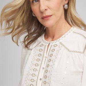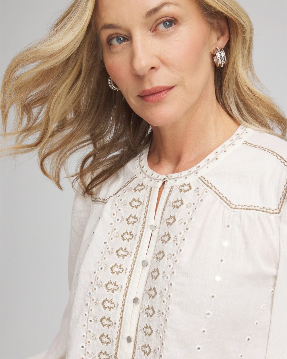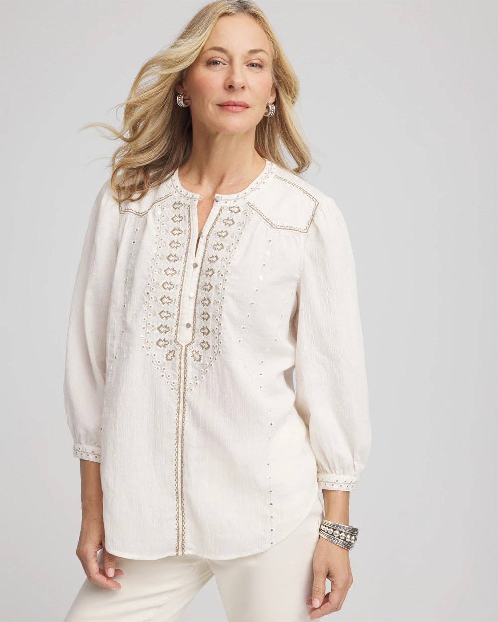 An embroidered blouse cut from crinkle cotton in rich, tonal hues, featuring mirror embellishments, shank button-closure with a half-placket. Showcasing shirring around the neckline and cuffs, this blouse adds a lovely statement to your transitional wardrobe.