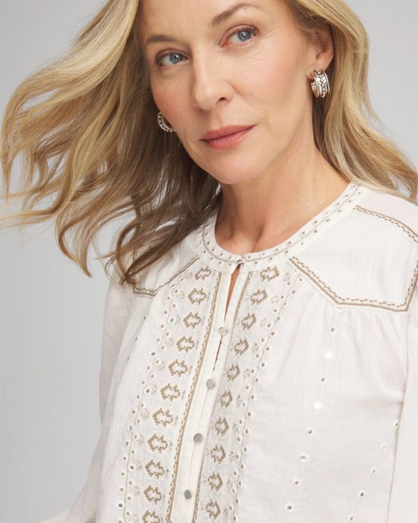 An embroidered blouse cut from crinkle cotton in rich, tonal hues, featuring mirror embellishments, shank button-closure with a half-placket. Showcasing shirring around the neckline and cuffs, this blouse adds a lovely statement to your transitional wardrobe.