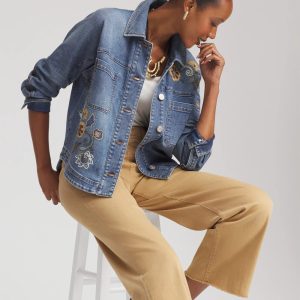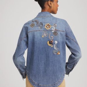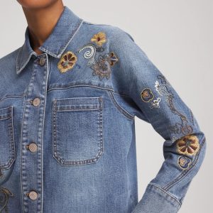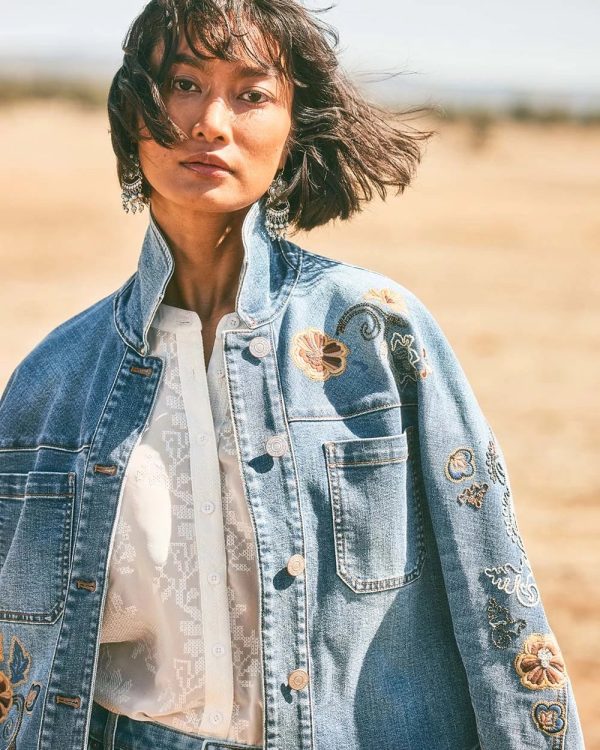 Crafted with light-rinse soft-stretch denim—drawing design inspiration from classic shirting details, this jacket features a shirttail hem, back yoke that extends into the sleeves, and two front patch pockets. Showcasing an intricate floral embroidery on the front and back, and shank buttons.
