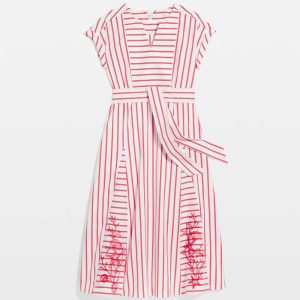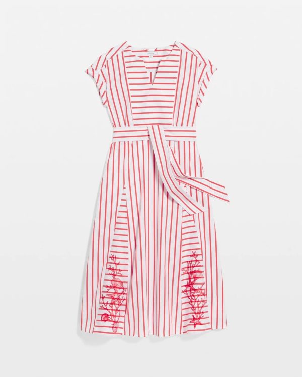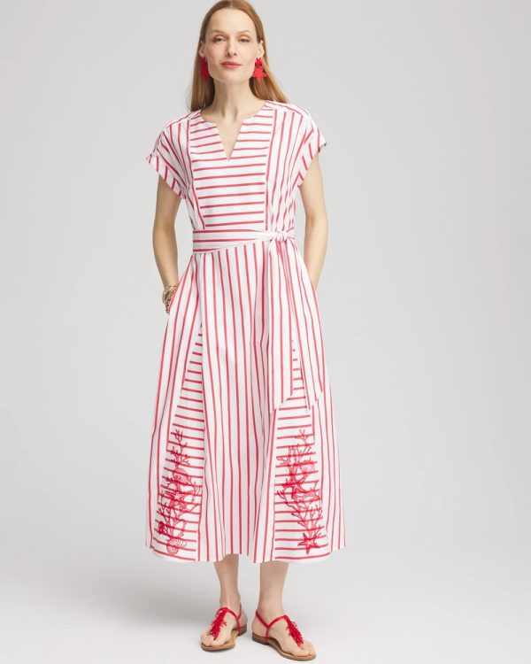 This new Striped Godet Poplin-Maxi Dress is designed with cuffed short sleeves and a breezy fit-and-flare silhouette. Its paneled skirt features inset godets with an intricate ocean-inspired coral reef embroidery, showcasing Chico’s devotion to stunning design. The perfect dress for Memorial Day, pair with matching coral reef motif jewelry for a showstopping look.