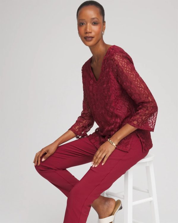 High-style construction showcasing sheer mesh sleeves, a flawless drape, and face-framing voop neckline help define this tunic. Pair with the season’s matching jeans for an instant casual chic style.