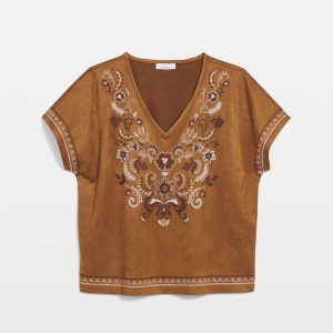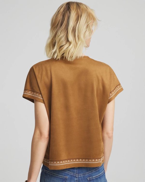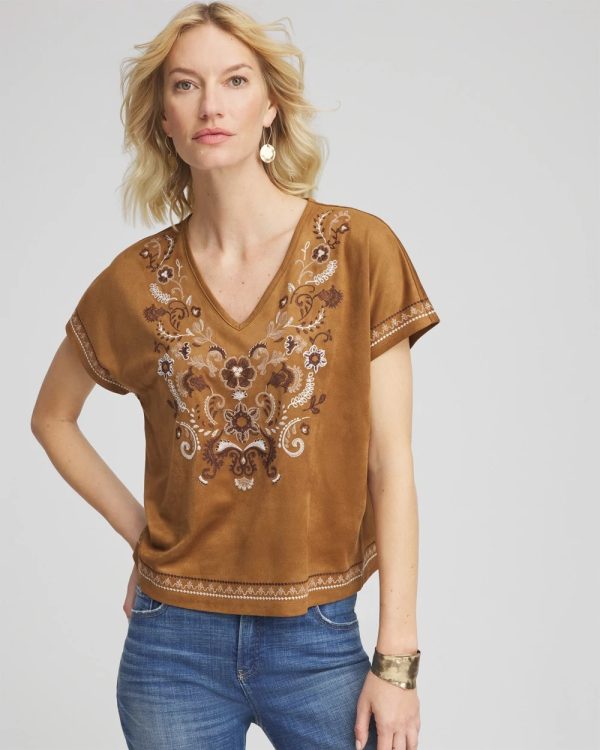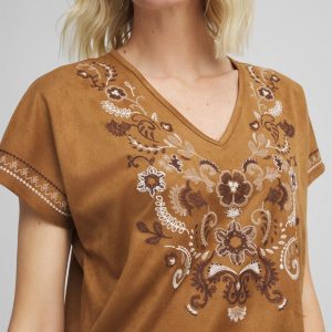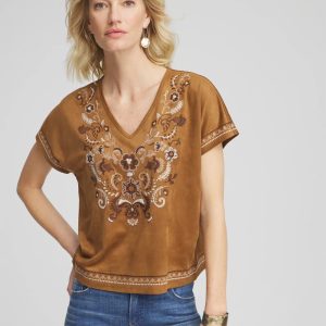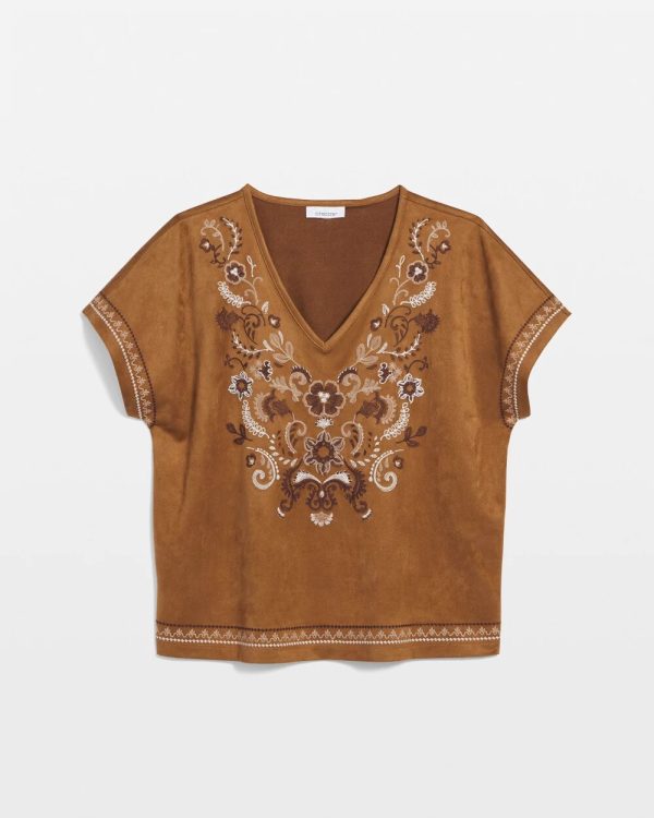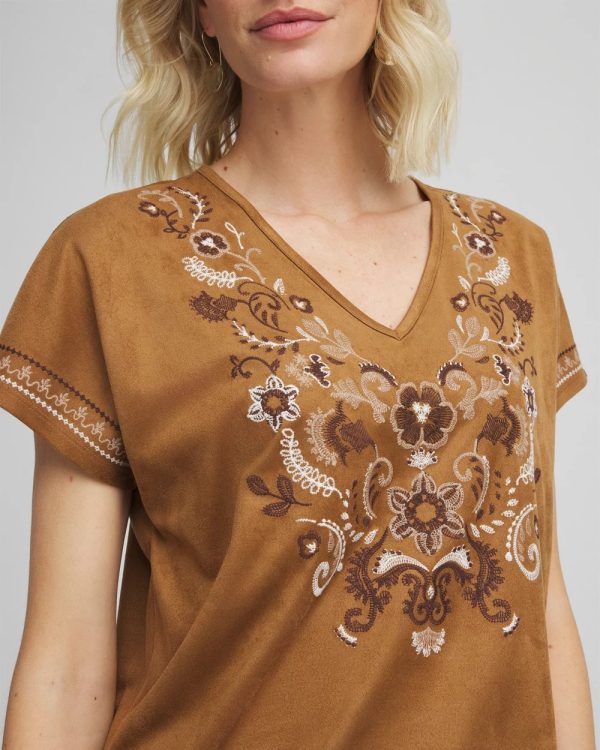 Extended cap sleeves and face-framing v-neckline help define this high-style embroidered tee. Pair with jeans, shorts or pull-on pants.