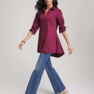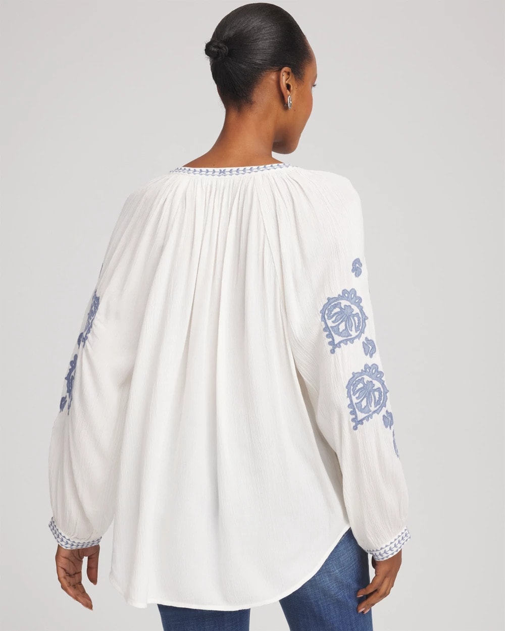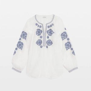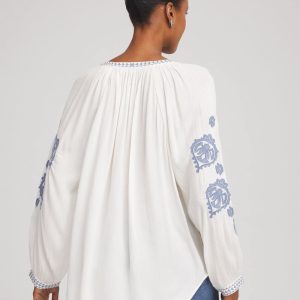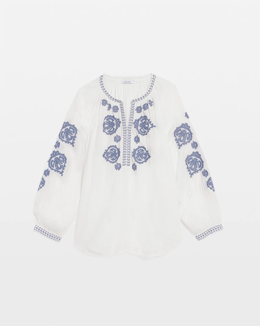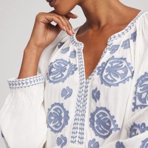 Luxurious viscose fabrication that has been woven for the perfect drape with a soothing blue embroidered placket and sleeve to create the romantic motif of this high-style splitneck shirt.
