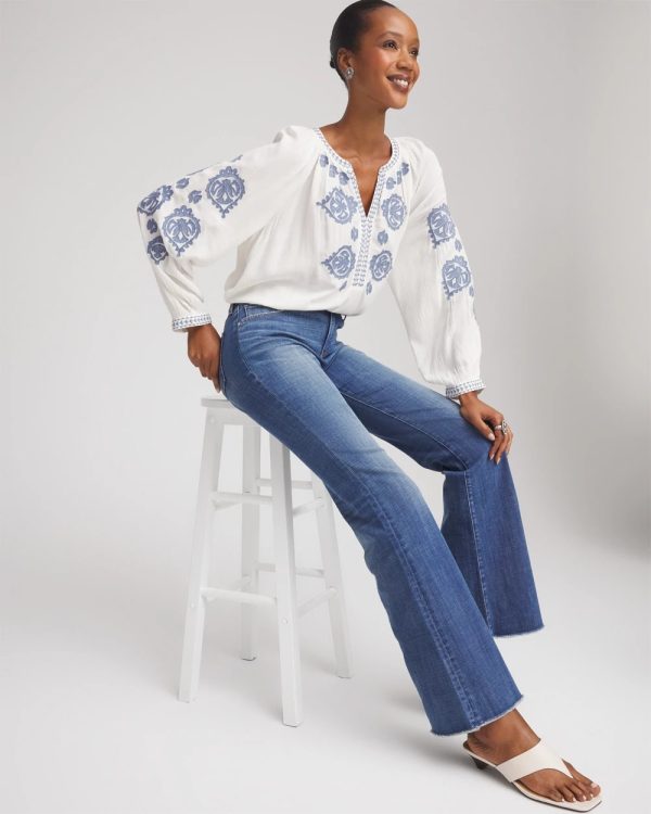 Luxurious viscose fabrication that has been woven for the perfect drape with a soothing blue embroidered placket and sleeve to create the romantic motif of this high-style splitneck shirt.