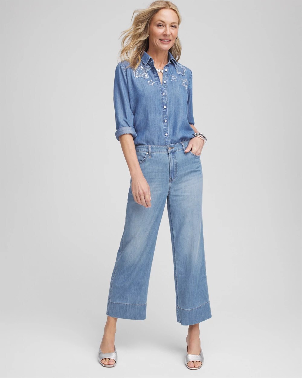 A classic denim shirt, re-imagined for the season. Showcasing festive star patchwork and embroidery detailing on a light, lived-in look Tencel™ denim backdrop. Stand collar with lapels, button-front, long-sleeved with a clean finish back yoke seam. Pair with matching jeans for a head-to-toe denim style.