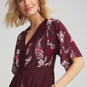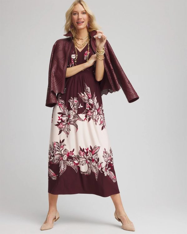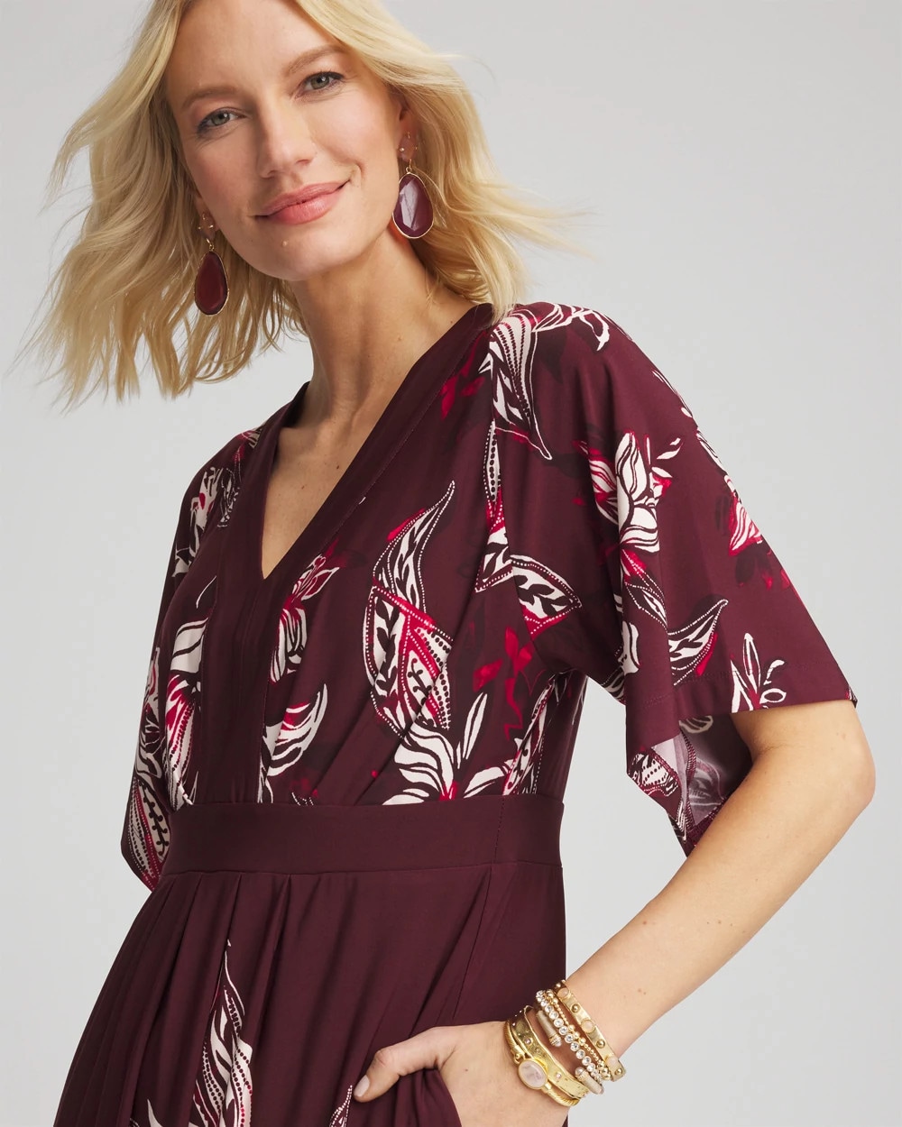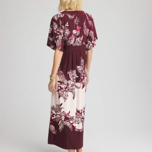 - V-neck, floral-print maxi dress with an A-line skirt, fluttery sleeves, and an empire silhouette.