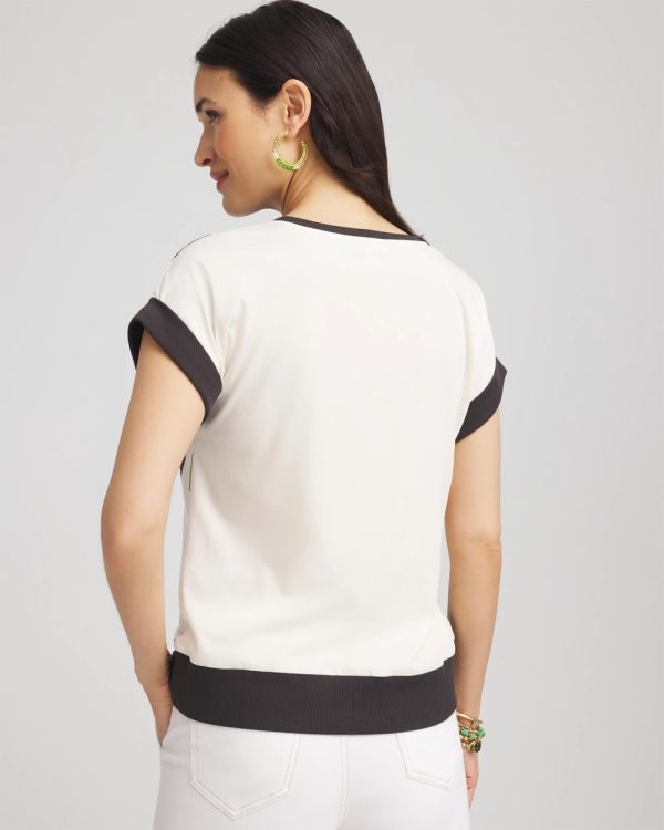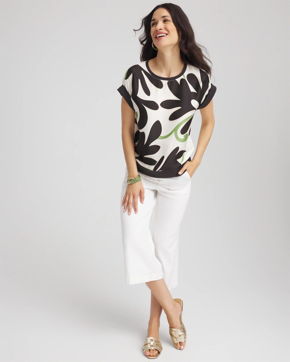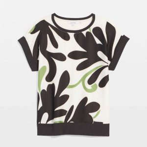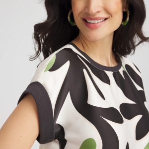 A versatile and eclectic essential, this figure-flattering top is characterized by a pima cotton back, luxurious satin front and rib-knit pattern crew neck, hemline, and cuff. Showcasing an artistic black floral print against an alabaster backdrop and awhimsicalgreen accent leaf.