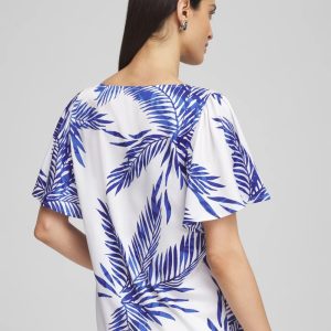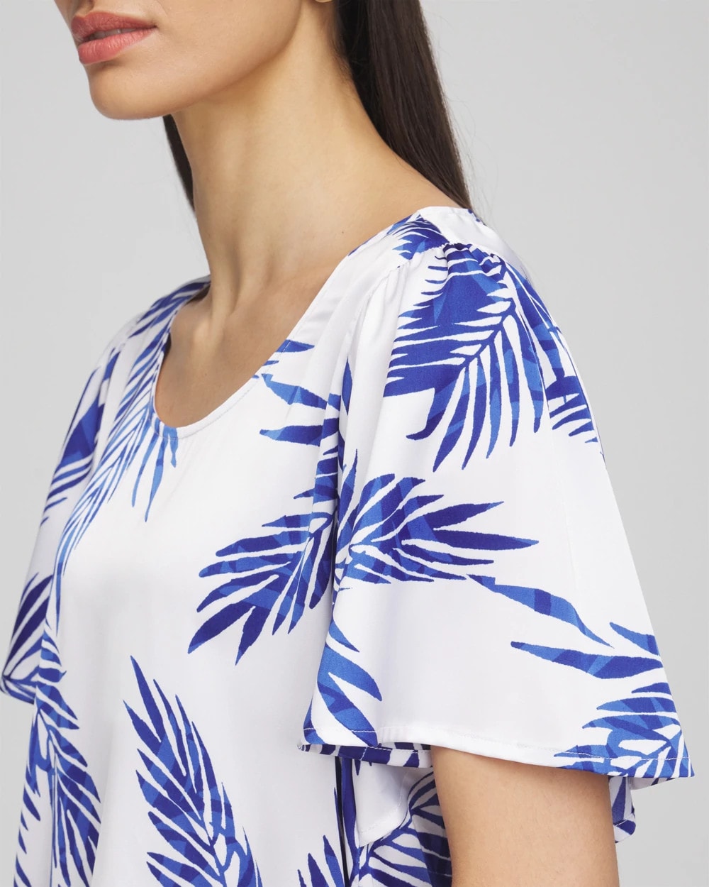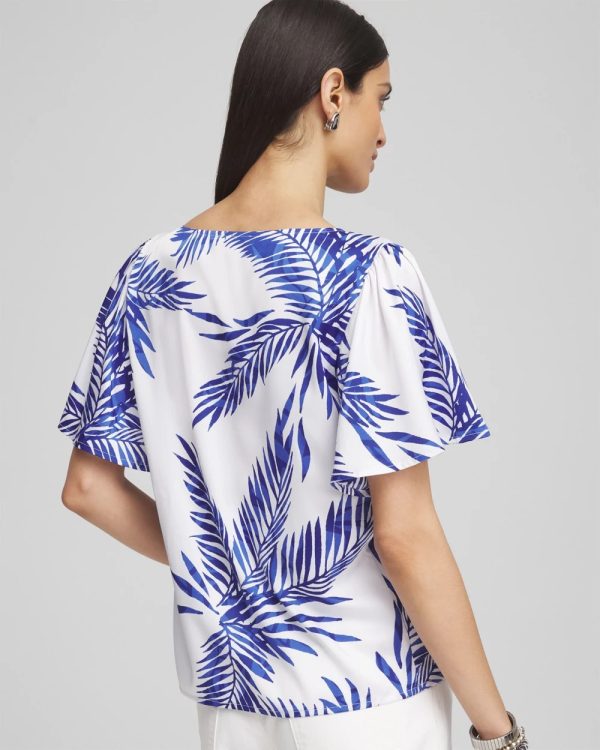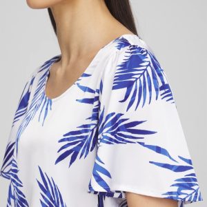Where comfort and luxury collide: short flutter sleeves with a side panel for added movement and a classic crewneckline top. Showcasing a painterly palm tree island print in rich royal blue set against a bright white backdrop. Dress up this polished regal island motif blouse with matching blue or white pants or go for a casual look by pairing with jeans.