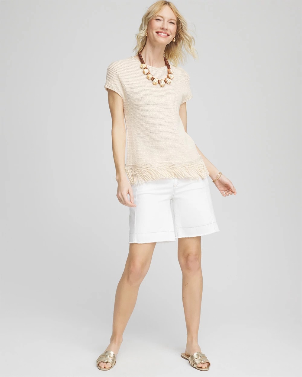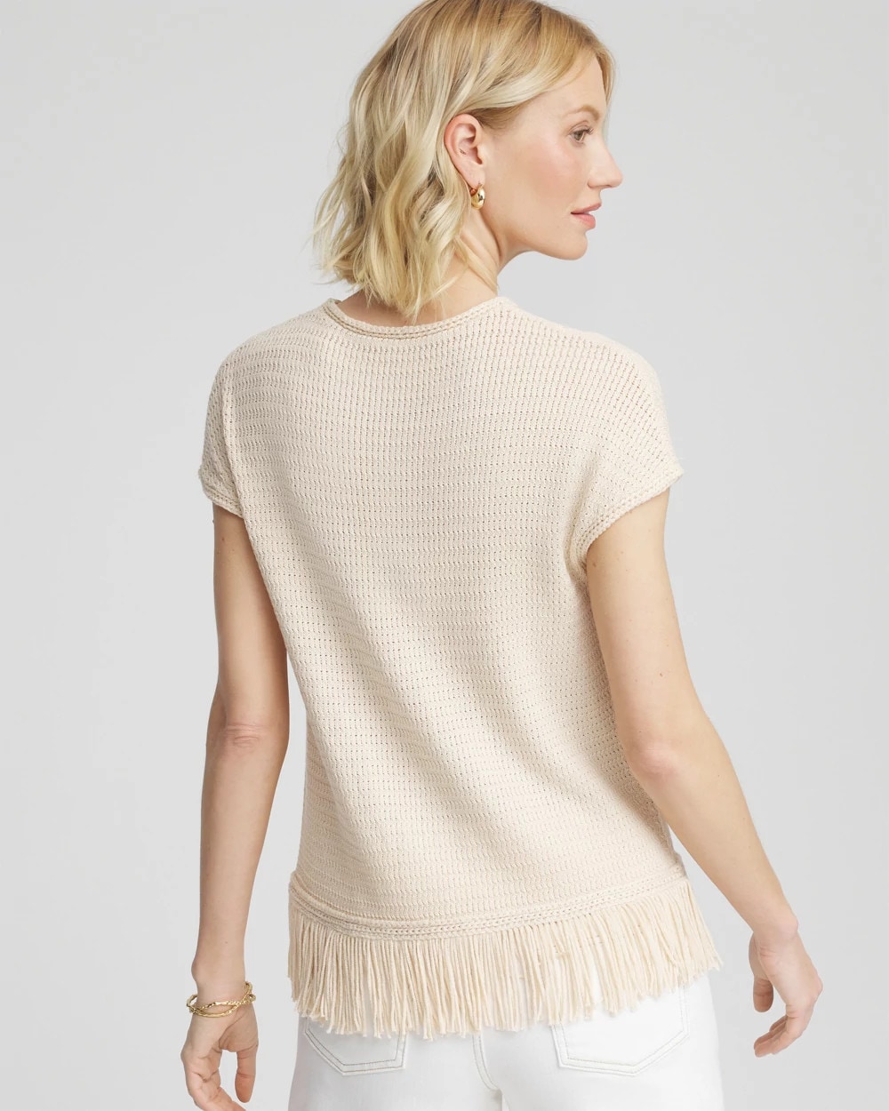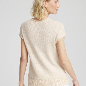 Braided trim cuff, neckline, and hem with 1920s style, modernized fringe detailing along the hemline. Traditional crewneck tee made glamorous with timeless style elements—sweater fabrication, extended shoulder short sleeves, and textured stitch.