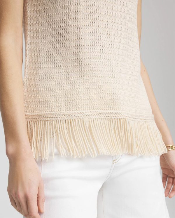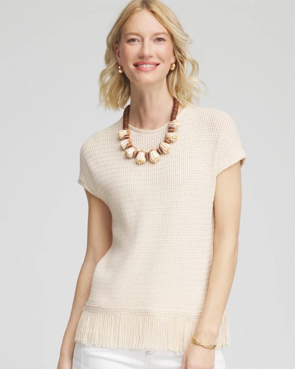 Braided trim cuff, neckline, and hem with 1920s style, modernized fringe detailing along the hemline. Traditional crewneck tee made glamorous with timeless style elements—sweater fabrication, extended shoulder short sleeves, and textured stitch.