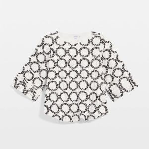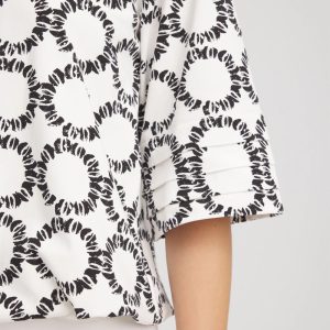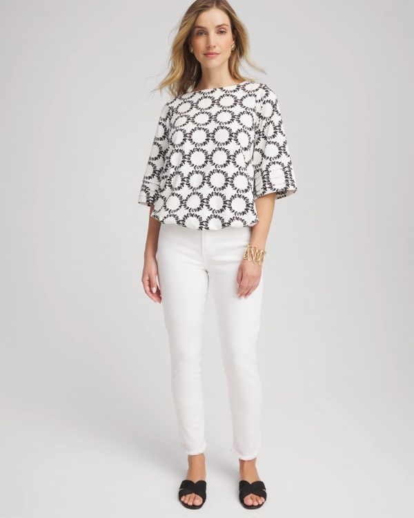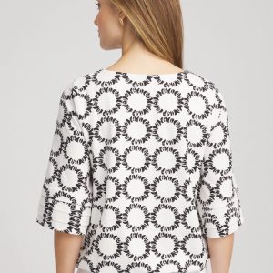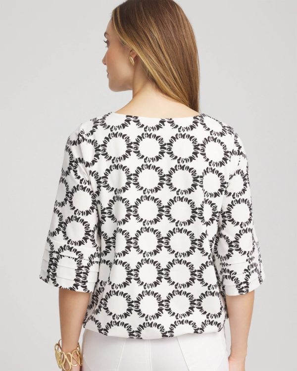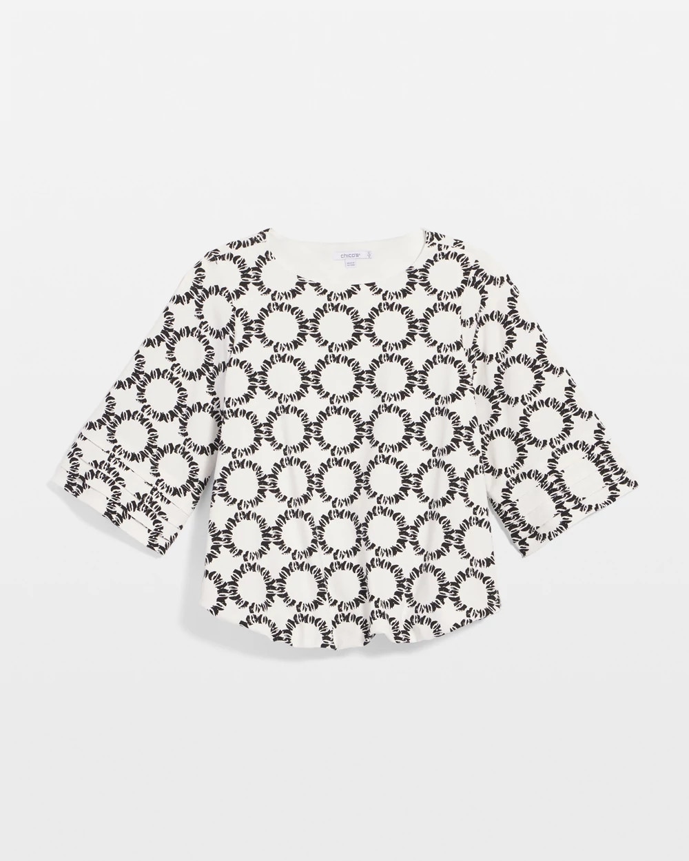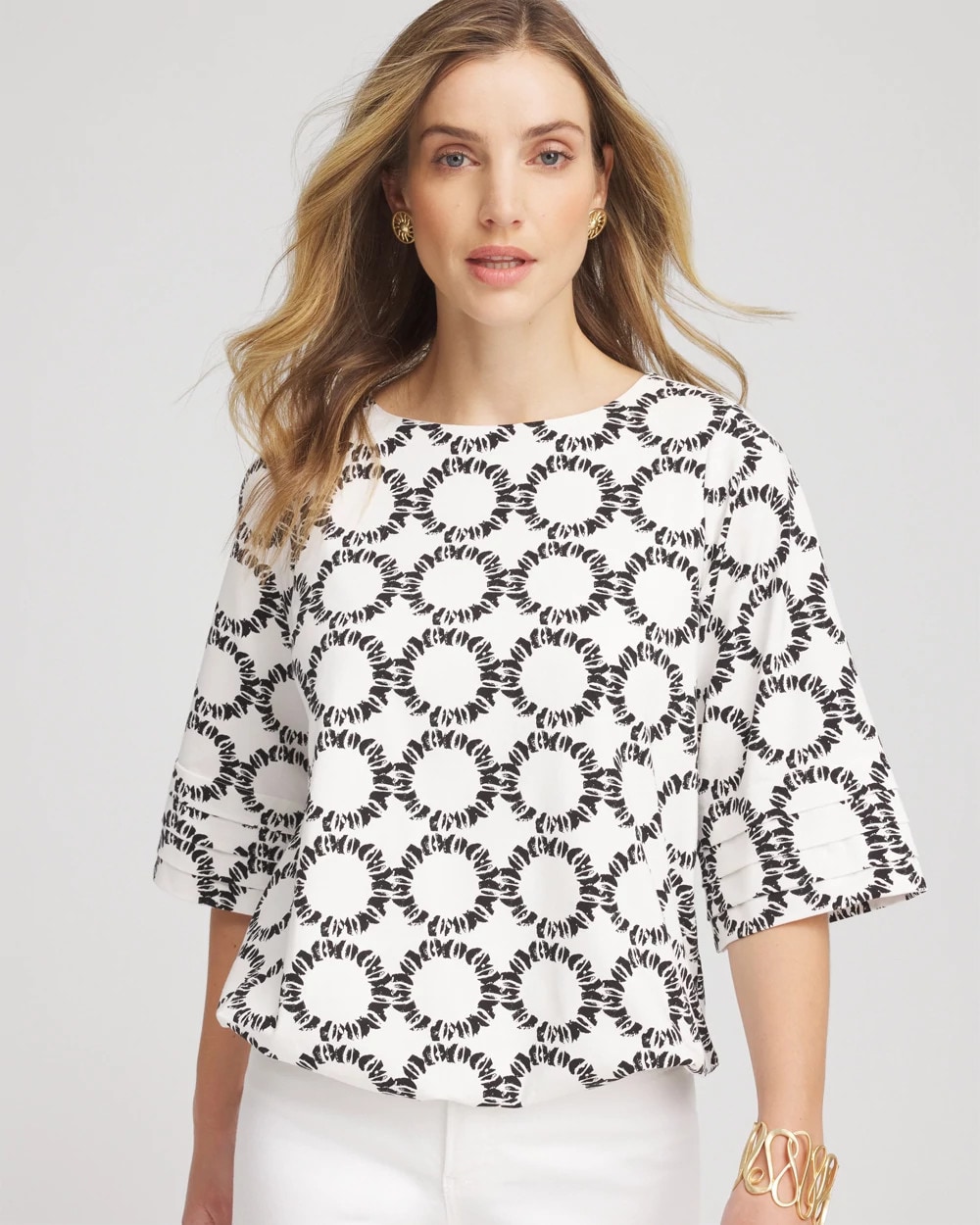 A luxurious alternative to a casual cotton top. Crafted of a cotton-blend fabrication, Chico’s bubble-hem top has tiered pleating details that elevate the—meticulously designed for feminine flare—bell sleeves. Showcasing a refined relaxed, lined body with unlined sleeves and black geo print against a white backdrop.