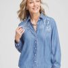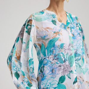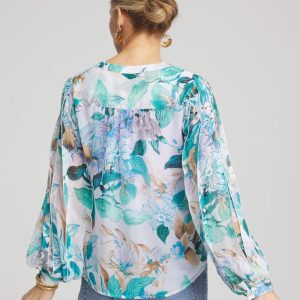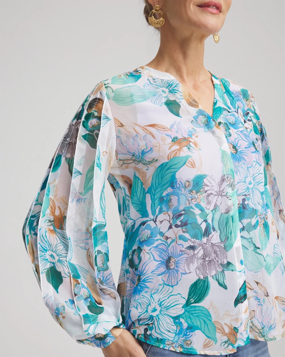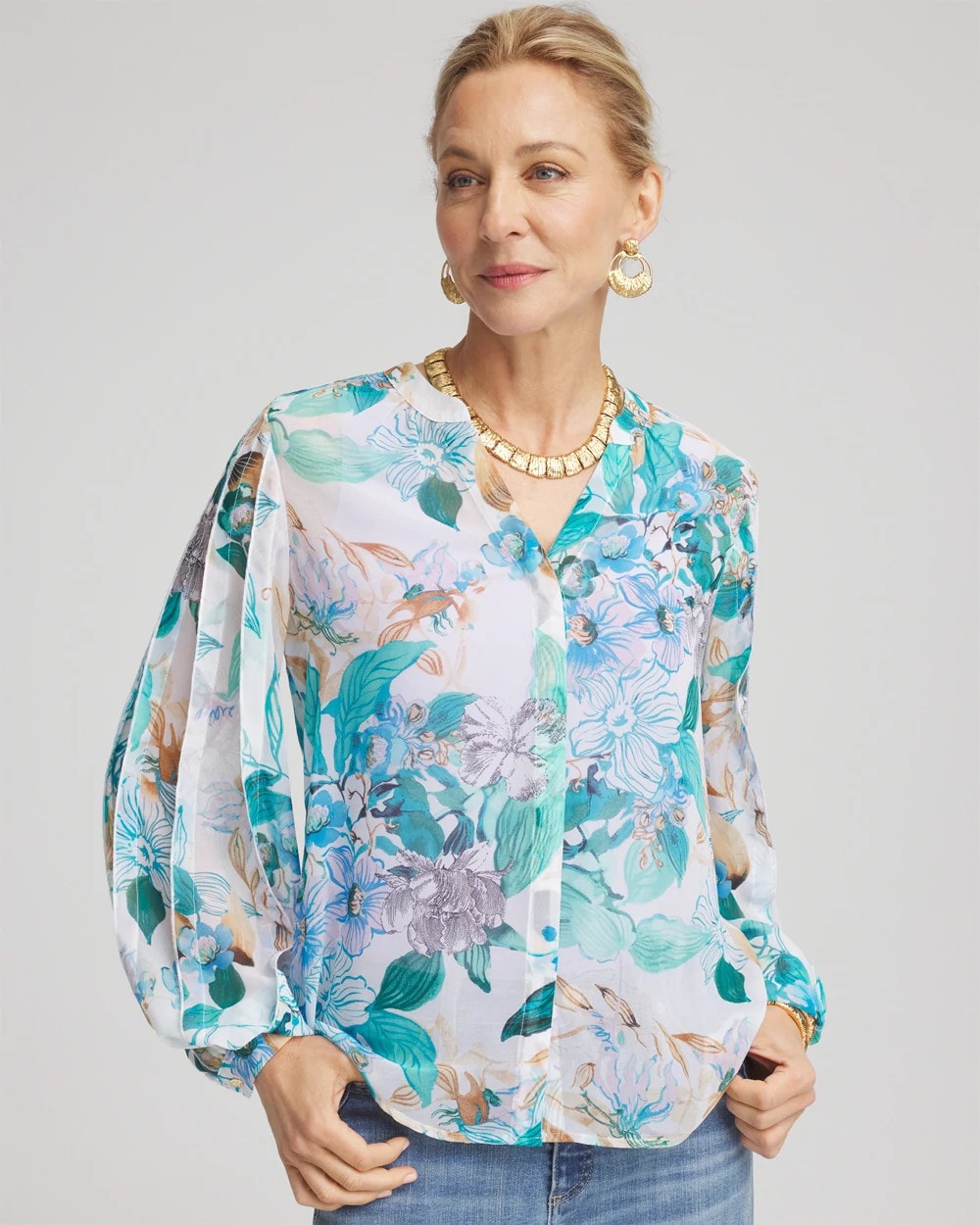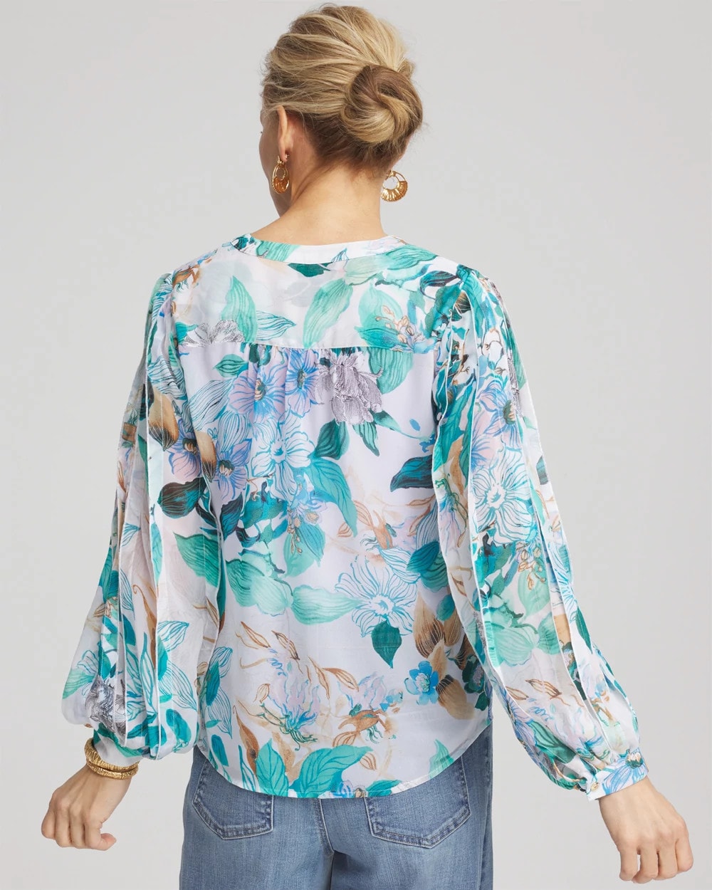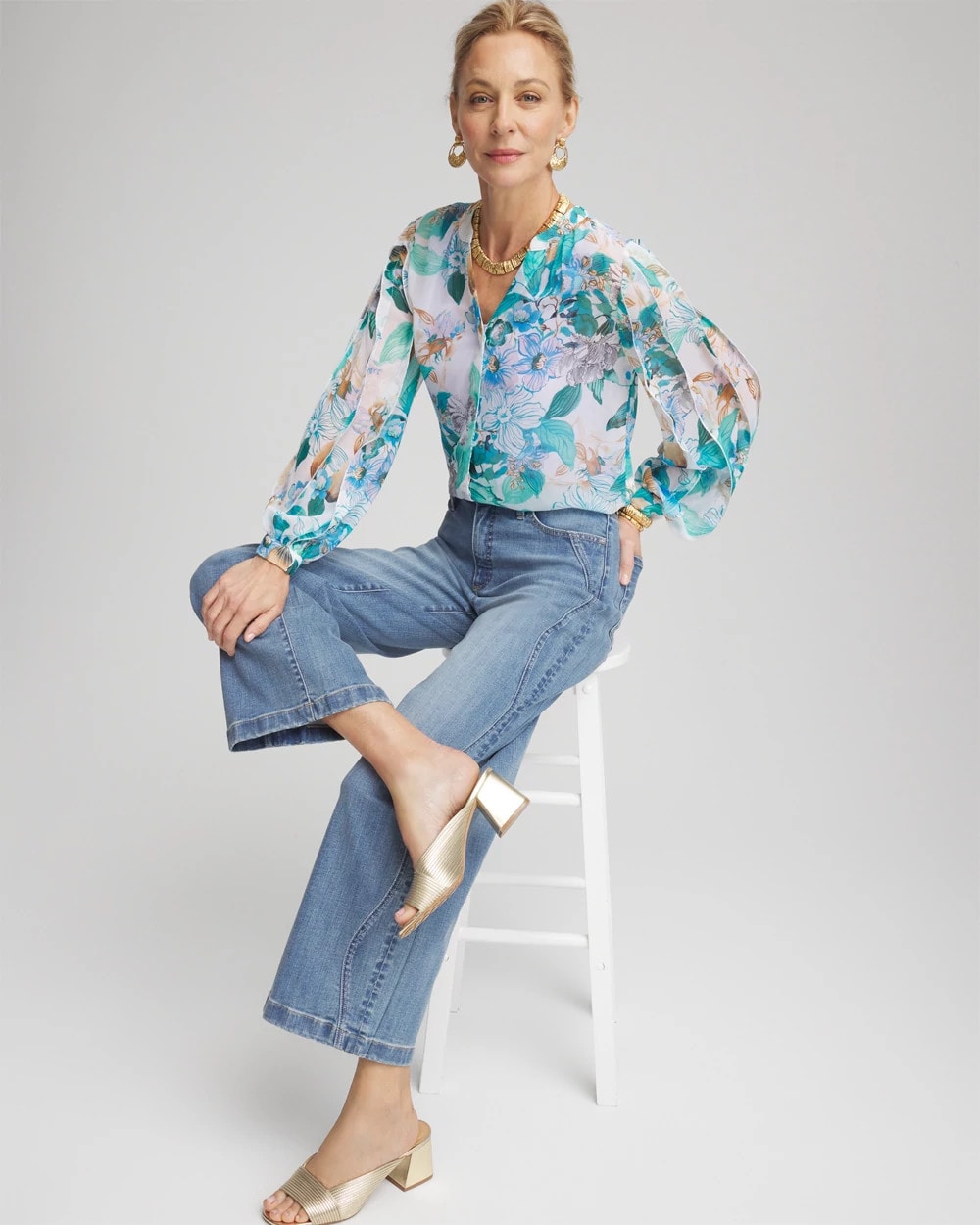 A stunning painterly print cast across a sheer neutral backdrop. Split neckline with long billowing sleeves cuffed at the end and a flattering back yoke. Concealed button-front placket. Pair with the denim trouser shorts for an easy breezy look.
