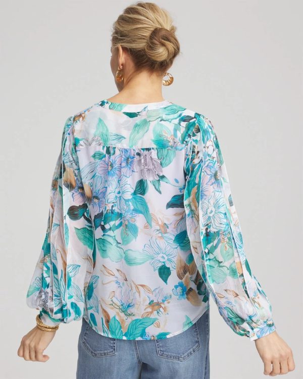 A stunning painterly print cast across a sheer neutral backdrop. Split neckline with long billowing sleeves cuffed at the end and a flattering back yoke. Concealed button-front placket. Pair with the denim trouser shorts for an easy breezy look.