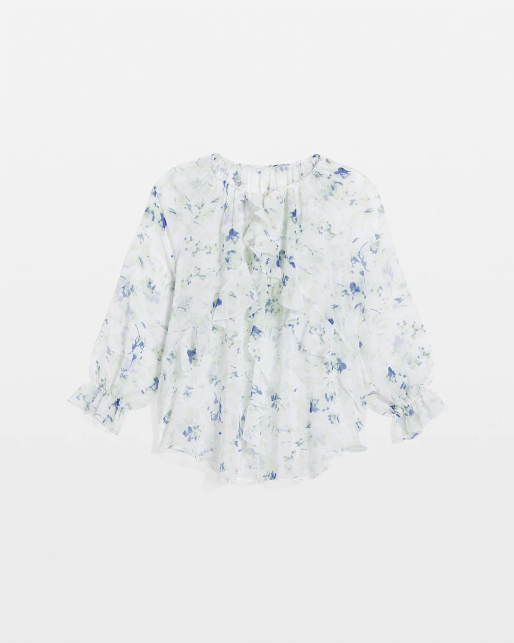 - Relaxed-fit with long sleeves, ruffled elastic cuffs, jewel neckline.