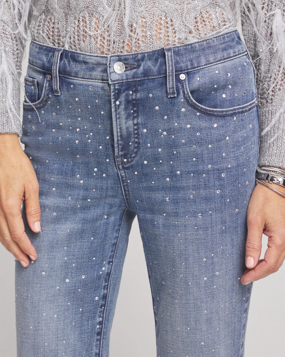 Meet our new embellished Girlfriend Flare Jeans. Featuring a subtle flare to instantly elongate your legs and beautiful all-over rhinestone detailing for a touch of class. Meticulously made in typical Chico’s fashion and with our coveted ultra tummy slimming inner lining. Pairs beautifully with your favorite Chico’s tops. Add this stunning wardrobe staple for the season to your closet.