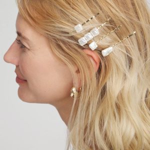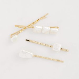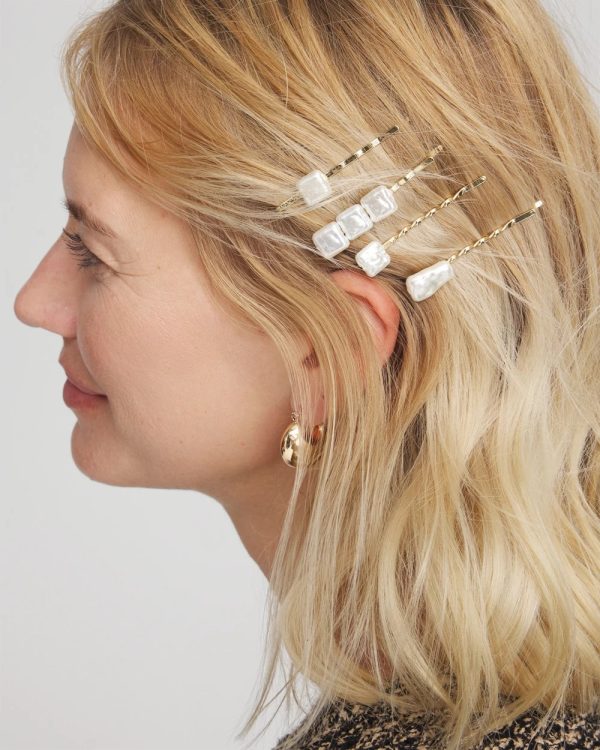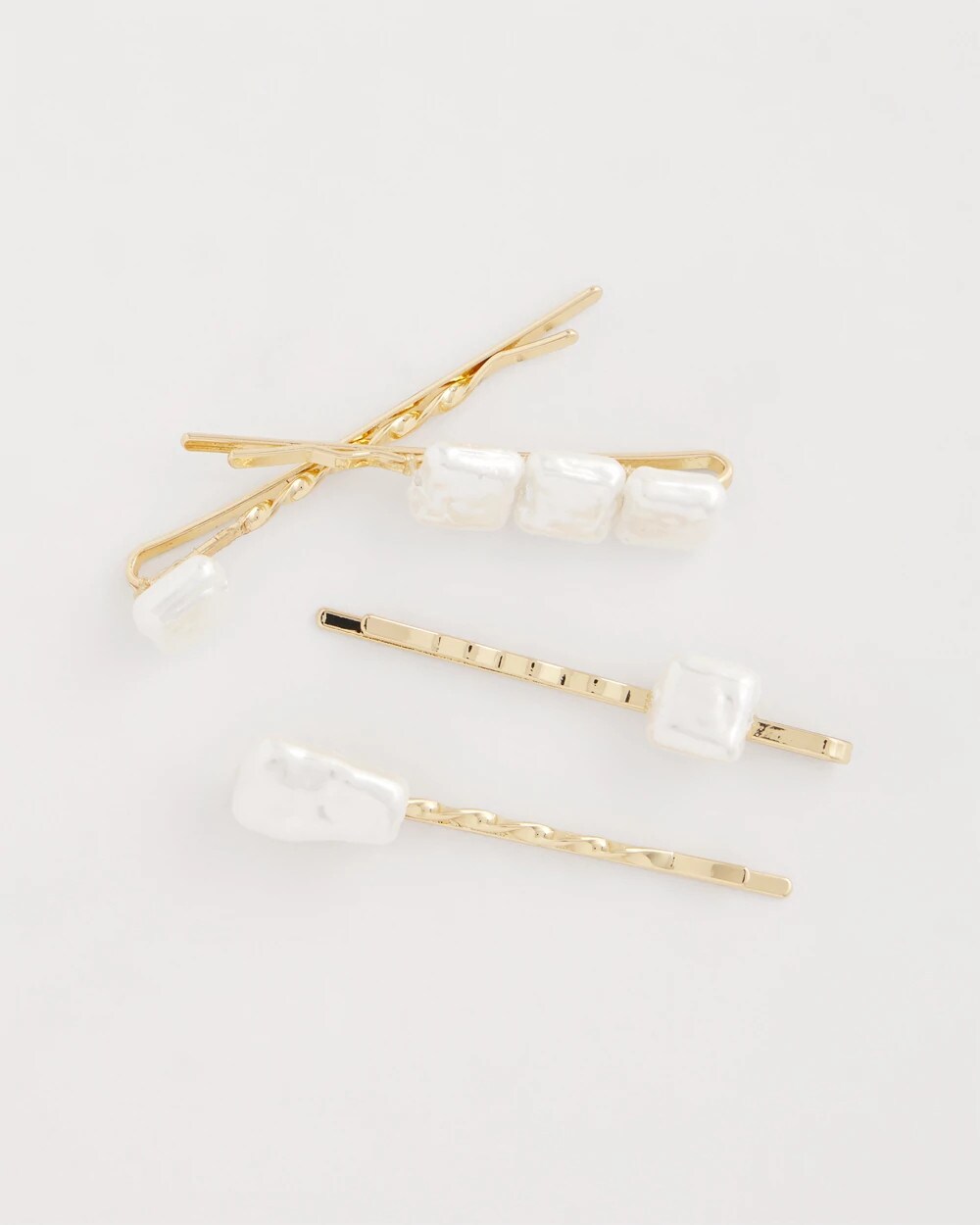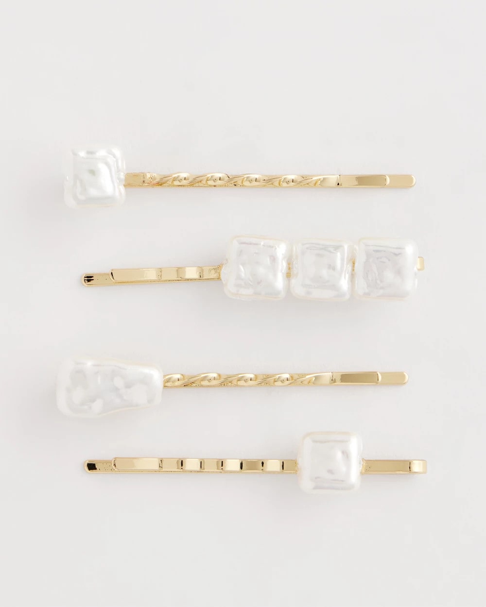 Goldtone hair pins that showcase a technique used to make pearl-like embellishments. Great for dressing up or casual days you just feel like a boost in confidence. Showcasing a special technique that recreates a pearl effect.