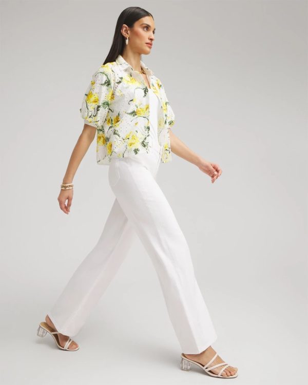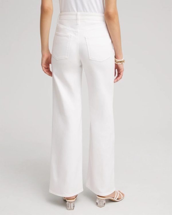 - Classic fit; high rise waist, wide leg, front & back pockets, front zipper & button closure, full length.