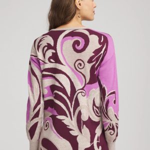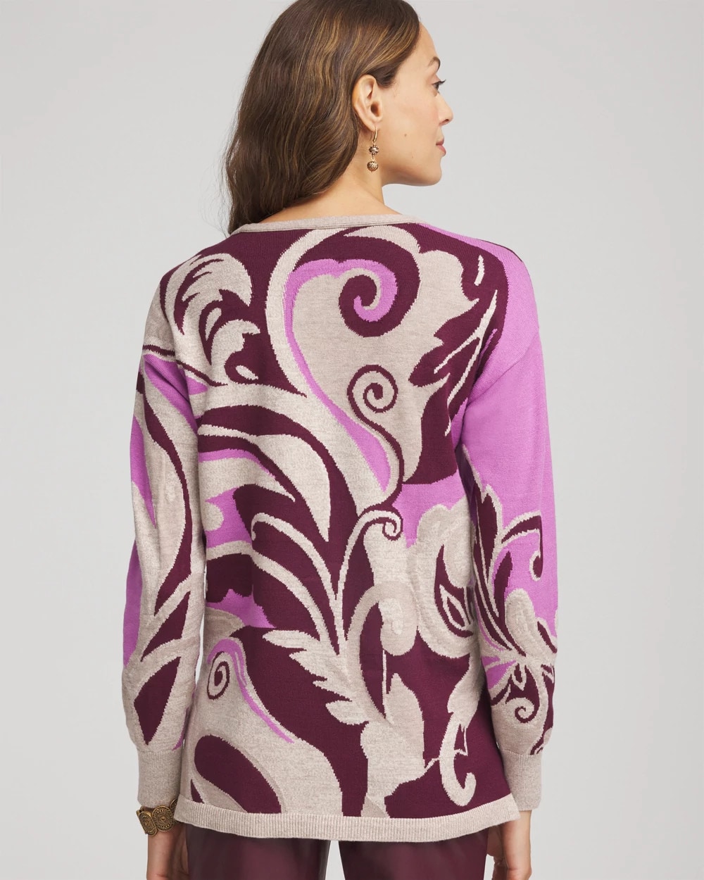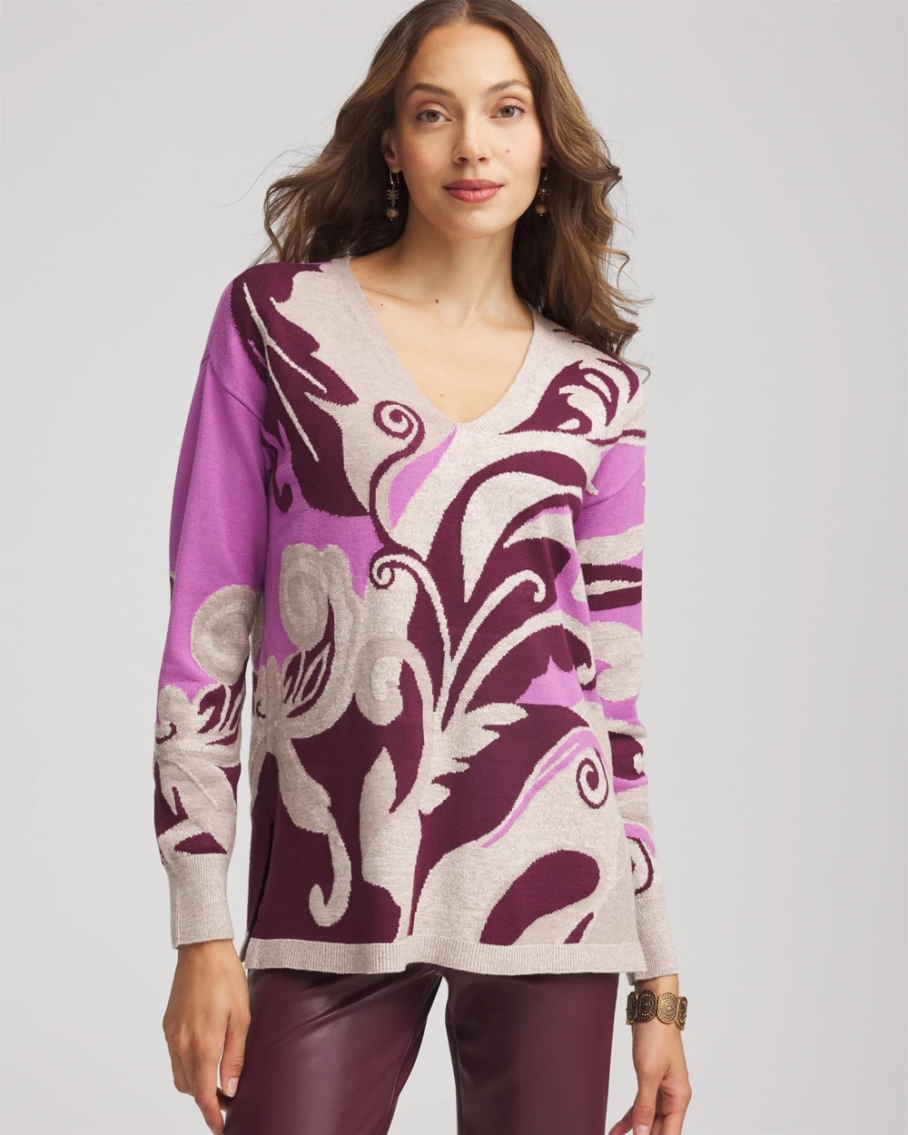 Add a dose of whimsy to your wardrobe with Chico’s Intarsia Knit V-Neck Pullover Sweater. Featuring rich red and pink hues, and side slits. Pair with the season’s matching pants.