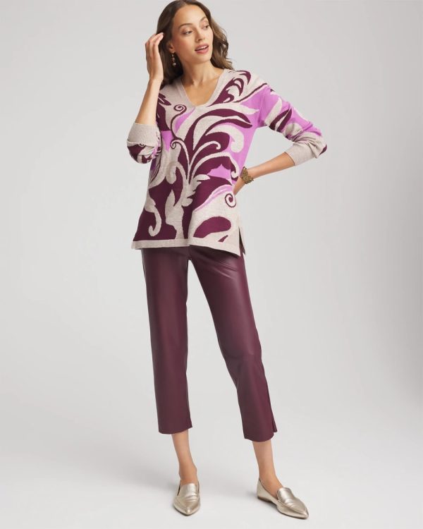 Add a dose of whimsy to your wardrobe with Chico’s Intarsia Knit V-Neck Pullover Sweater. Featuring rich red and pink hues, and side slits. Pair with the season’s matching pants.