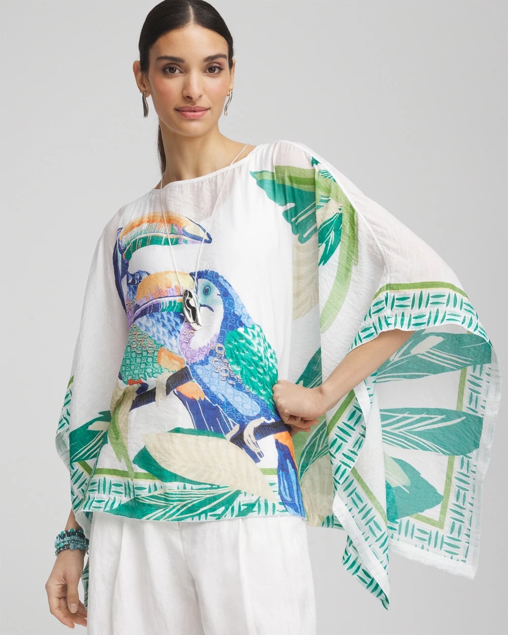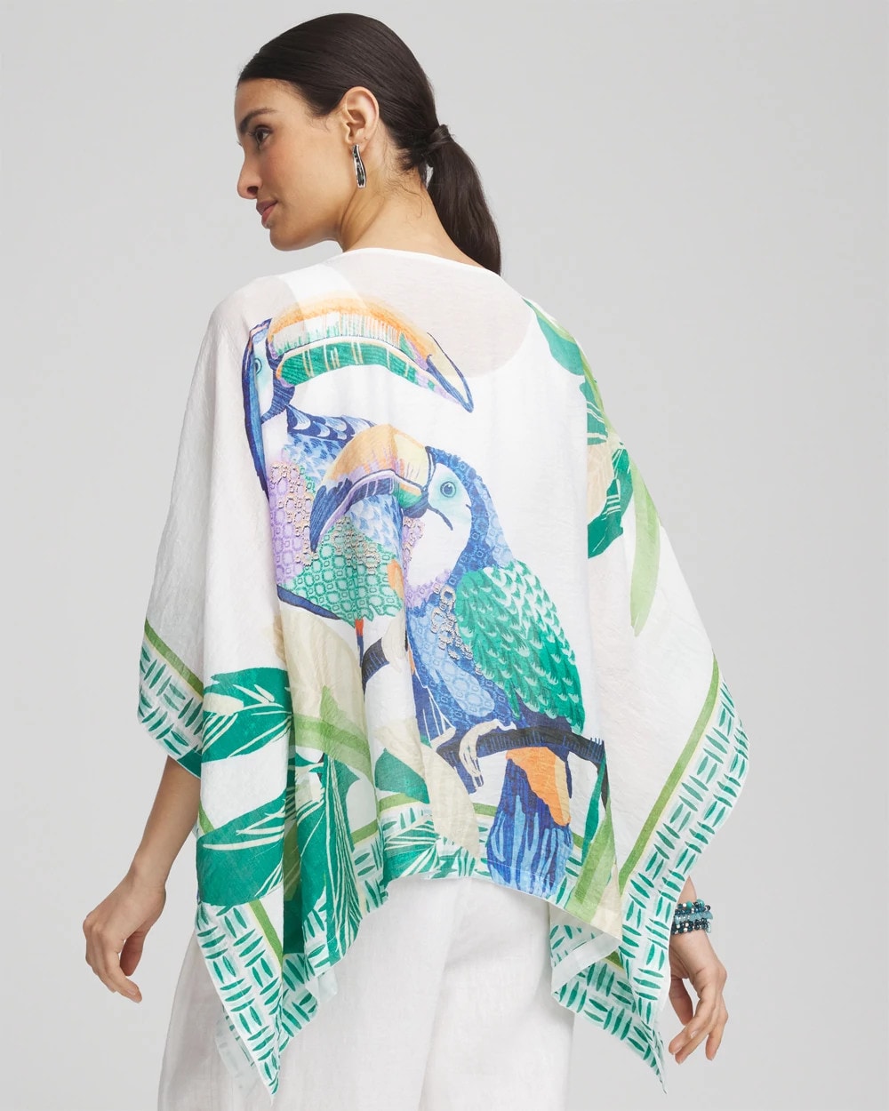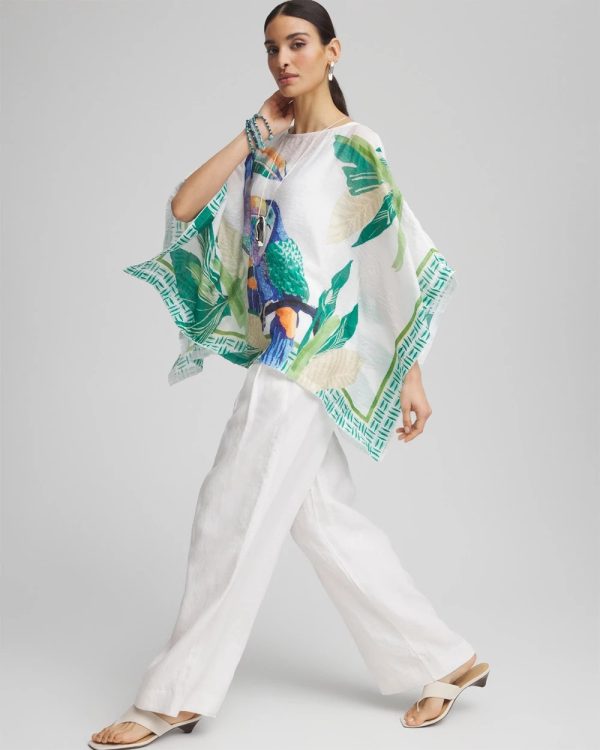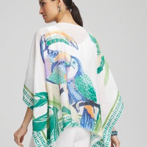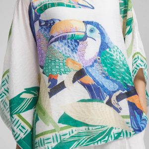 Don’t miss out on this, perfect for vacation, Island Motif Poncho. Showcasing an expertly designed set of tropical toucans in their natural habitat print on a solid alabaster backdrop. Featuring the season’s blue, purple, green, orange, and neutral hues with an exotic graphic border-trim print and boat neckline. Dress it down with jeggings on casual days, or dress is up with pants for more upscale affairs.