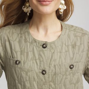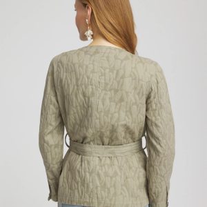 Crafted with cotton-linen gauze, this field jacket features two patch pockets, side pockets, a silhouette-defining self-belt, and a collarless neckline. Sumptuous fabrication adds a luxurious touch, while inner lining snaps provide signature style.